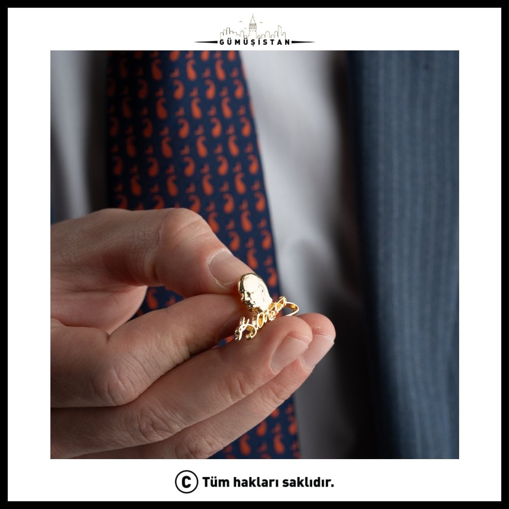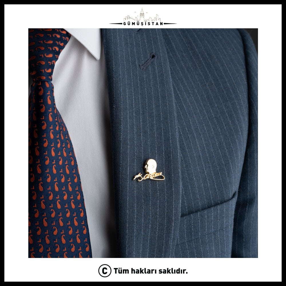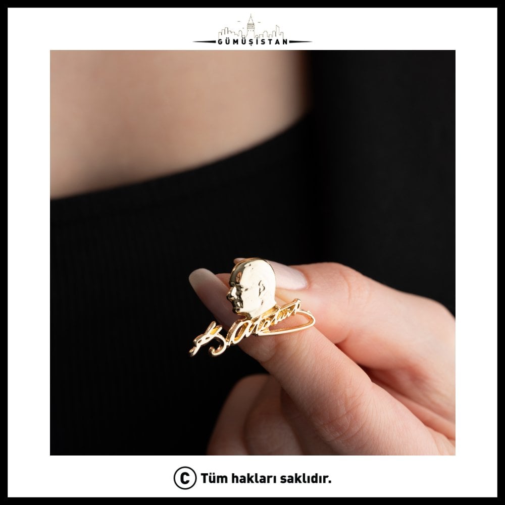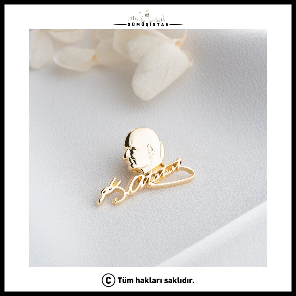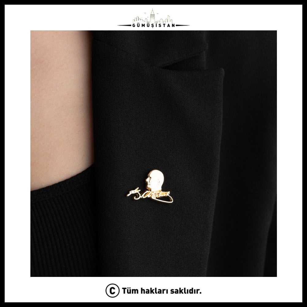 Mustafa Kemal Atatürk, Türk asker ve devlet adamı. Türk Kurtuluş Savaşı'nın başkomutanı, Türkiye Cumhuriyeti'nin kurucusu ve ilk cumhurbaşkanıdır. Atatürk imzalı bu broş, 14 ayar altın kaplama ve ahşap kutu ile sunulan nadir bir takı parçasıdır. Atatürk'ün imzasını içeren bu broş, Türkiye'de ve Türk tarihinde büyük bir öneme sahip olan Mustafa Kemal Atatürk'ü anmak ve ona saygı göstermek isteyen kişiler için tasarlanmıştır.