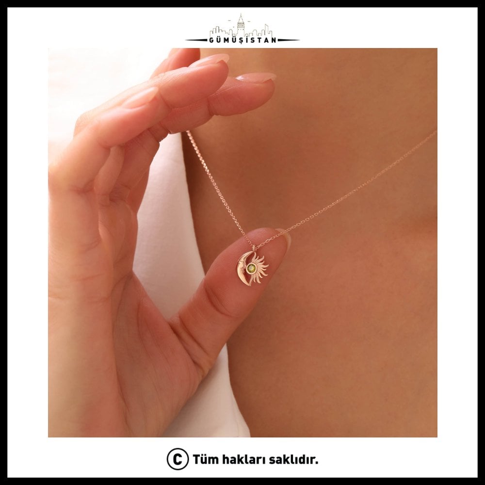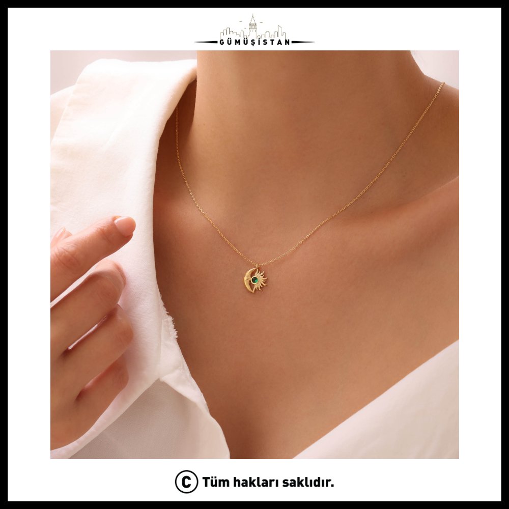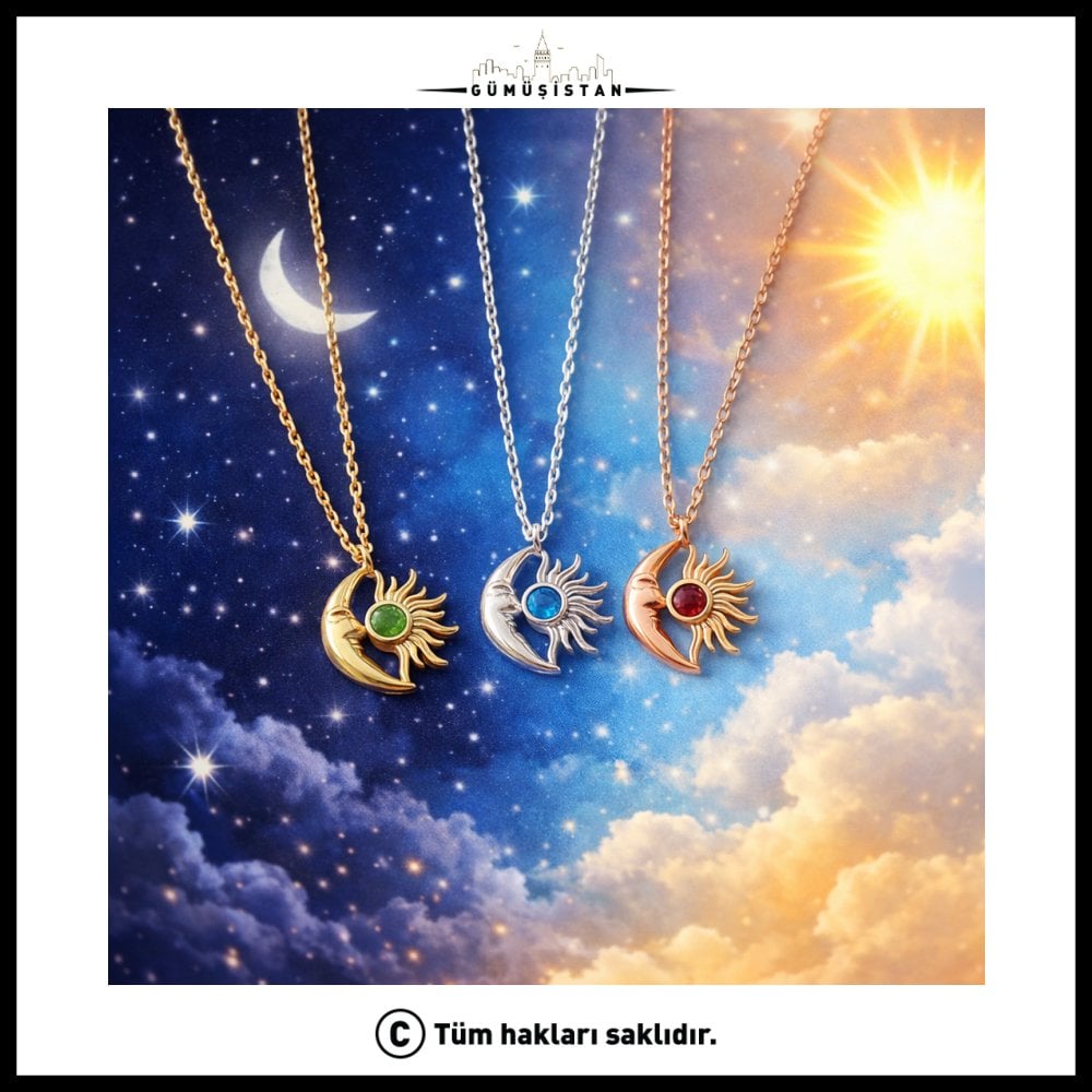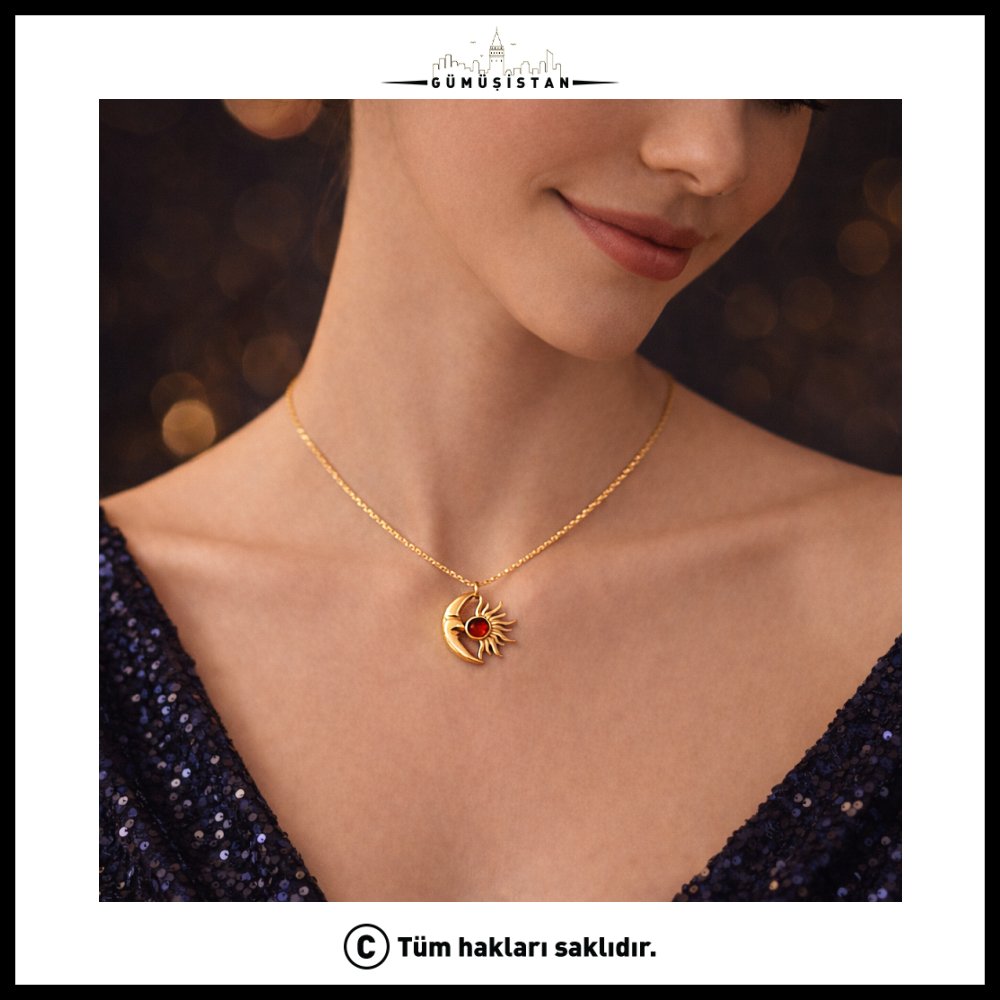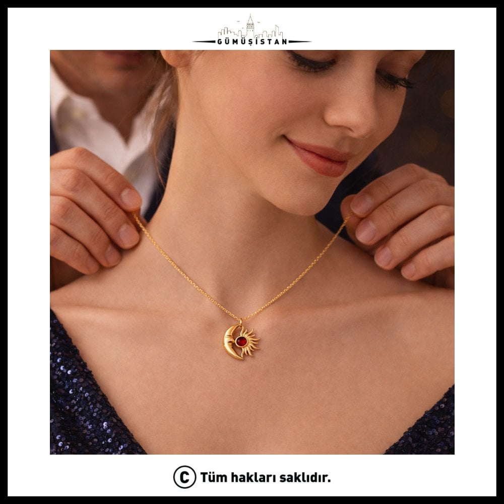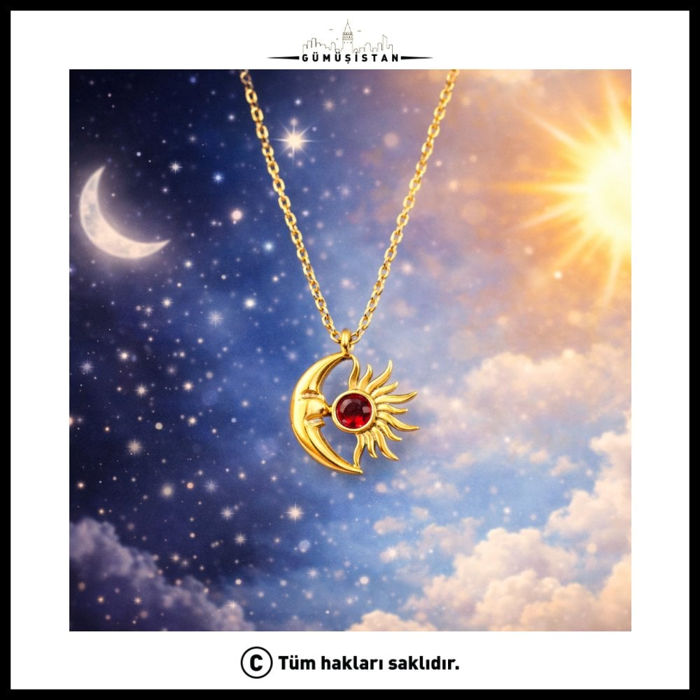 14 ayar altın kaplama “Gece & Gündüz” tasarımlı ay taşı kolye; ay ve güneşin zarif birleşimiyle şık, anlamlı ve enerjiyi dengeleyen takı.