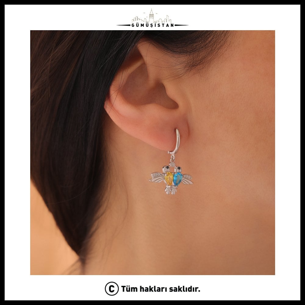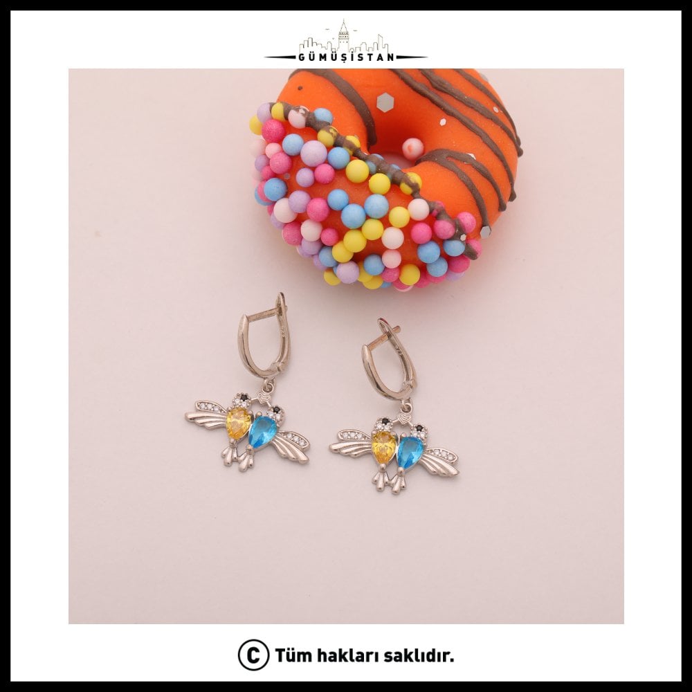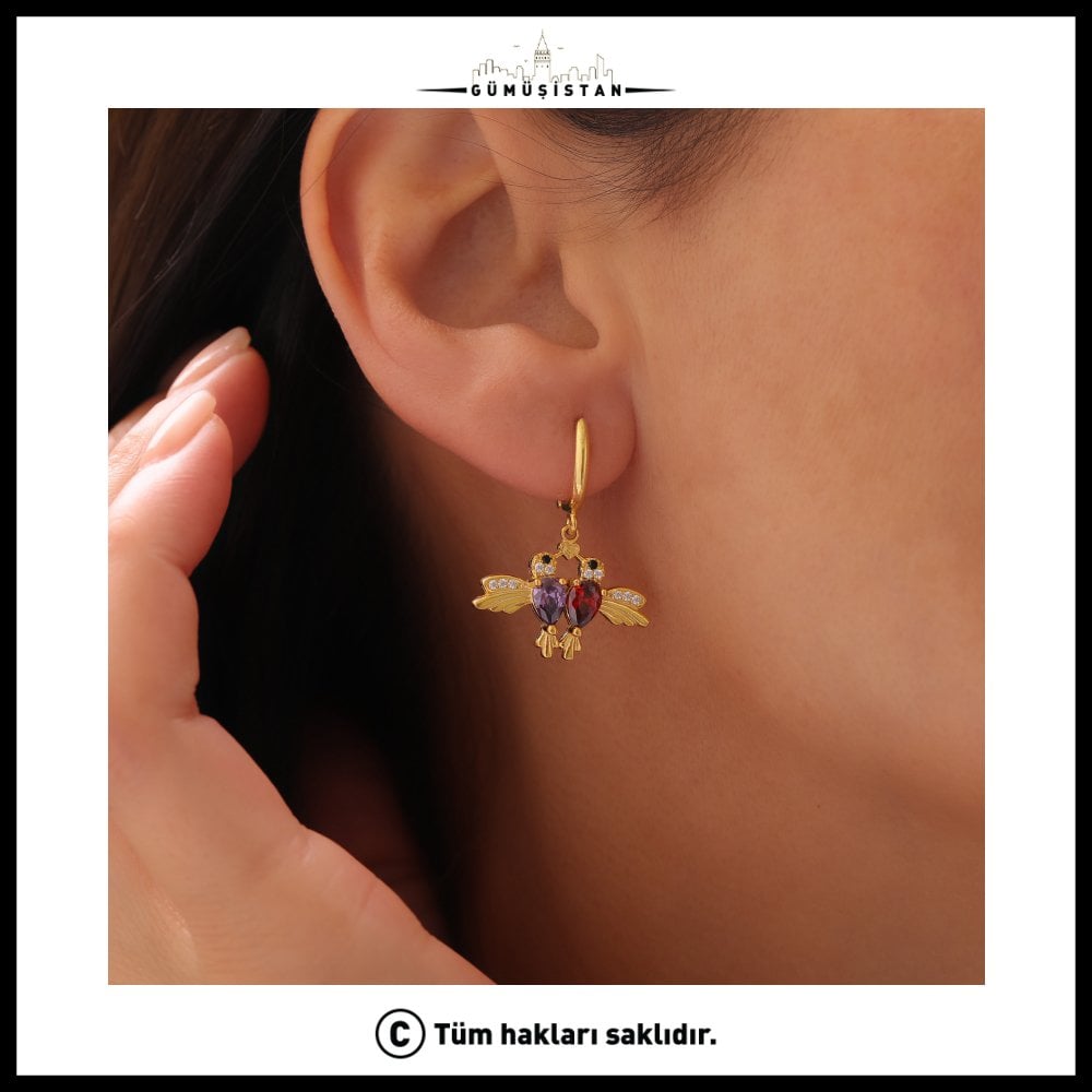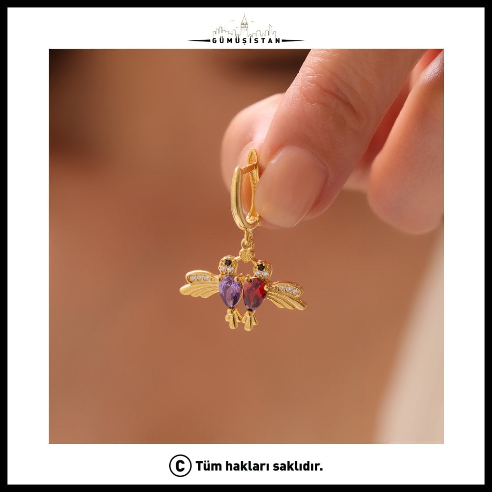 14 Ayar Altın Kaplama Kişiye Özel Çift Doğum Taşlı Bujiteri Arı Kuşu Küpe