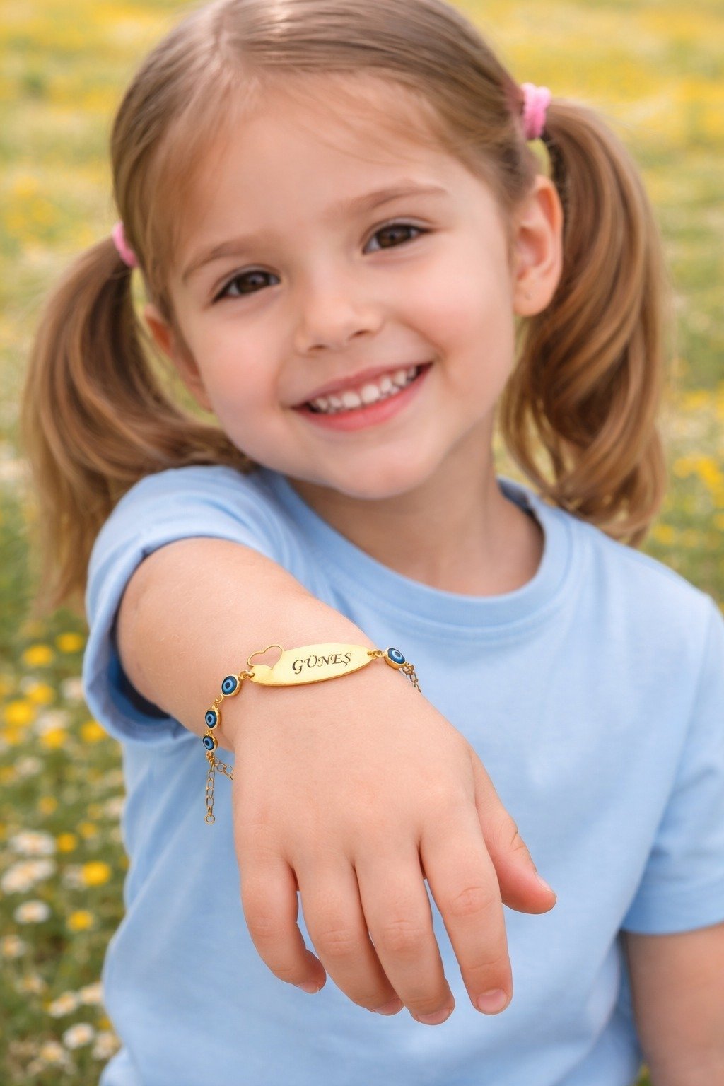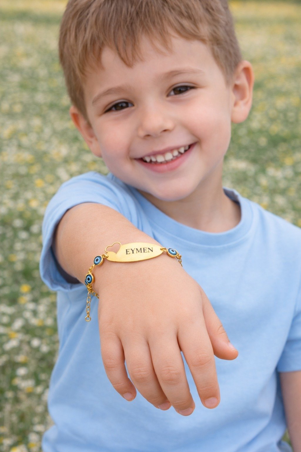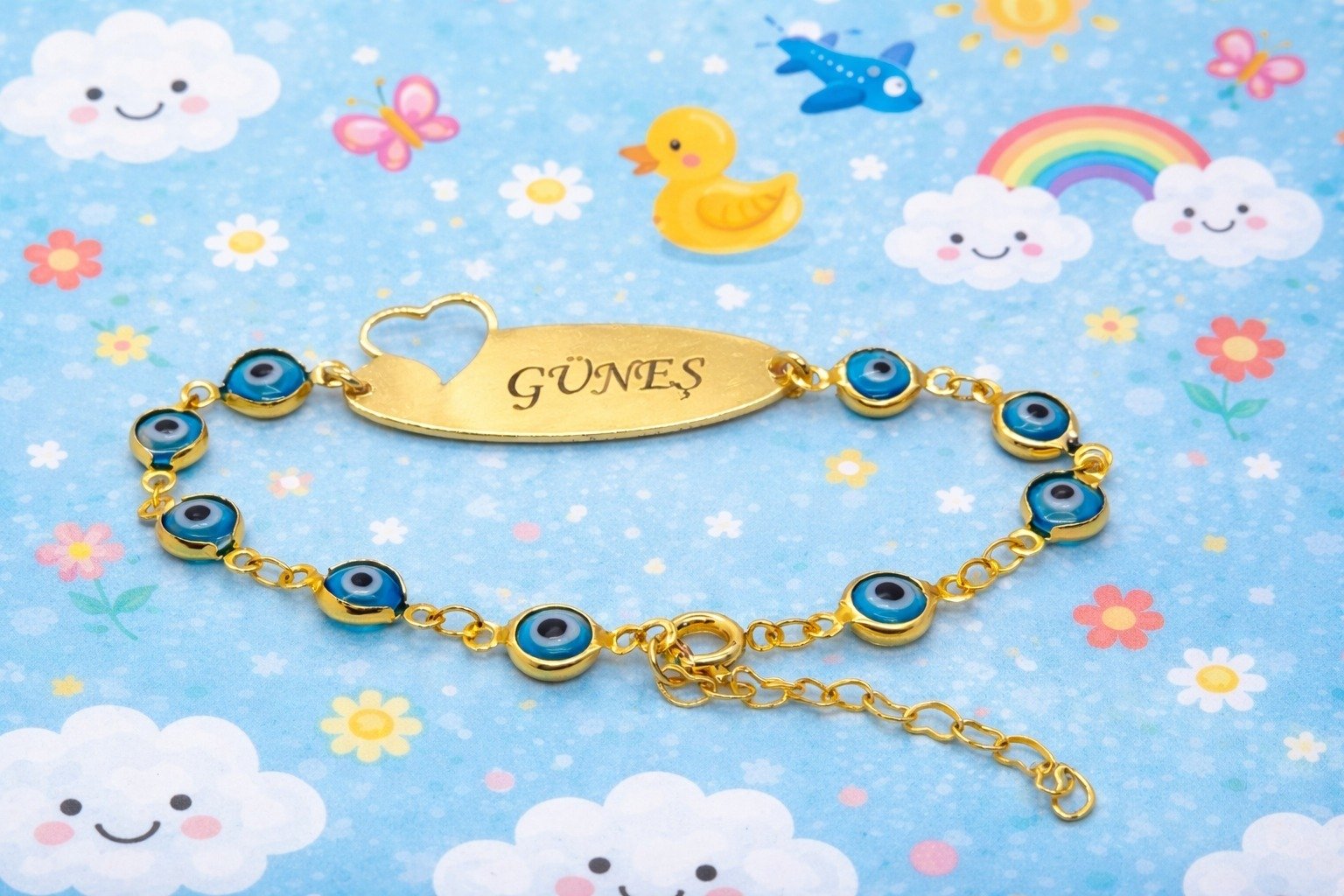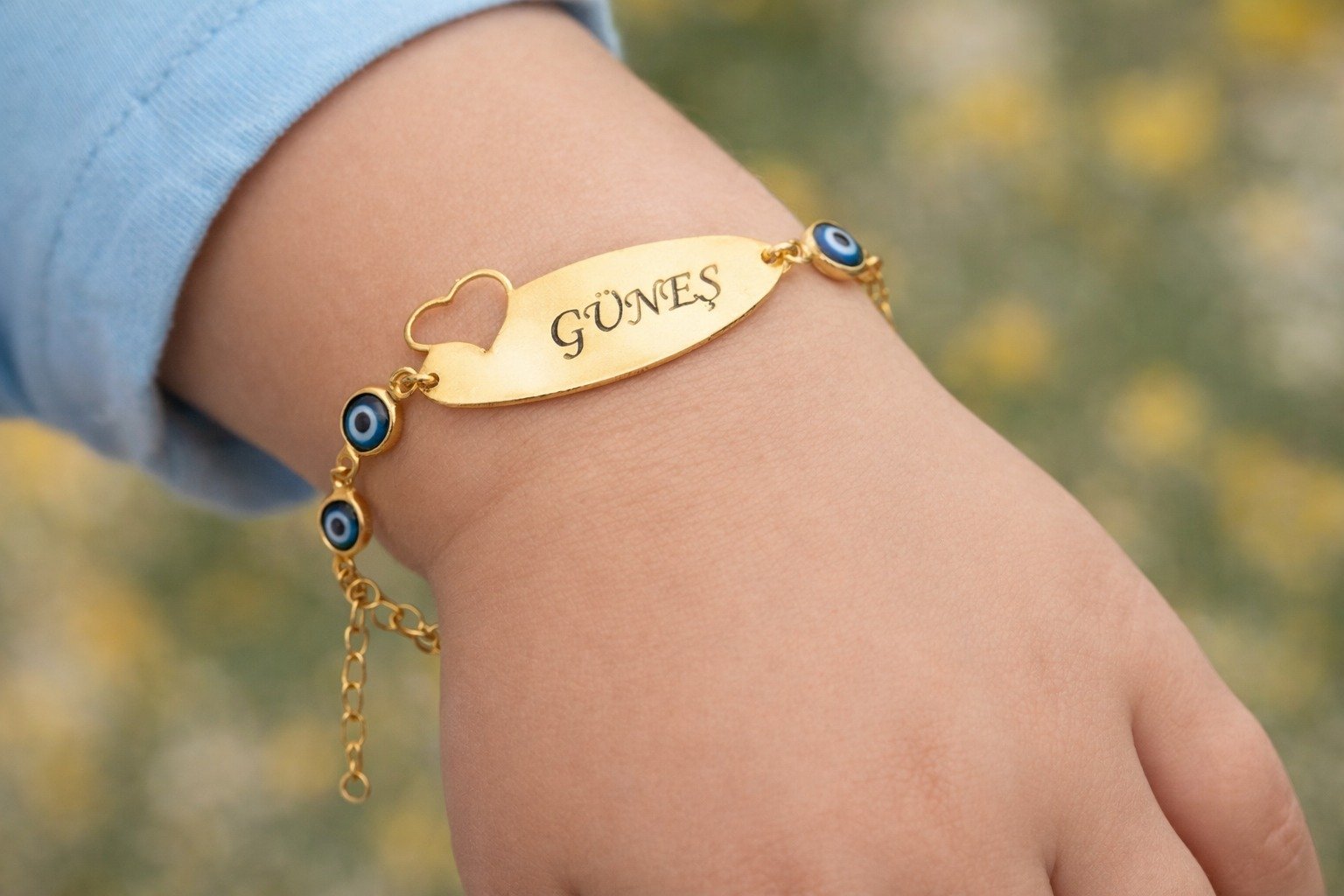 Nazar boncuk detaylarıyla süslenmiş, tamamen kişiye özel hazırlanabilen bu 14 ayar altın kaplama çocuk bilekliği, minikler için hem şık hem de anlamlı bir aksesuar seçeneğidir. Üzerine istediğiniz ismi yazdırarak özel bir hediye haline getirebilirsiniz. Günlük kullanıma uygun dayanıklı yapısıyla uzun süre parlaklığını korur.