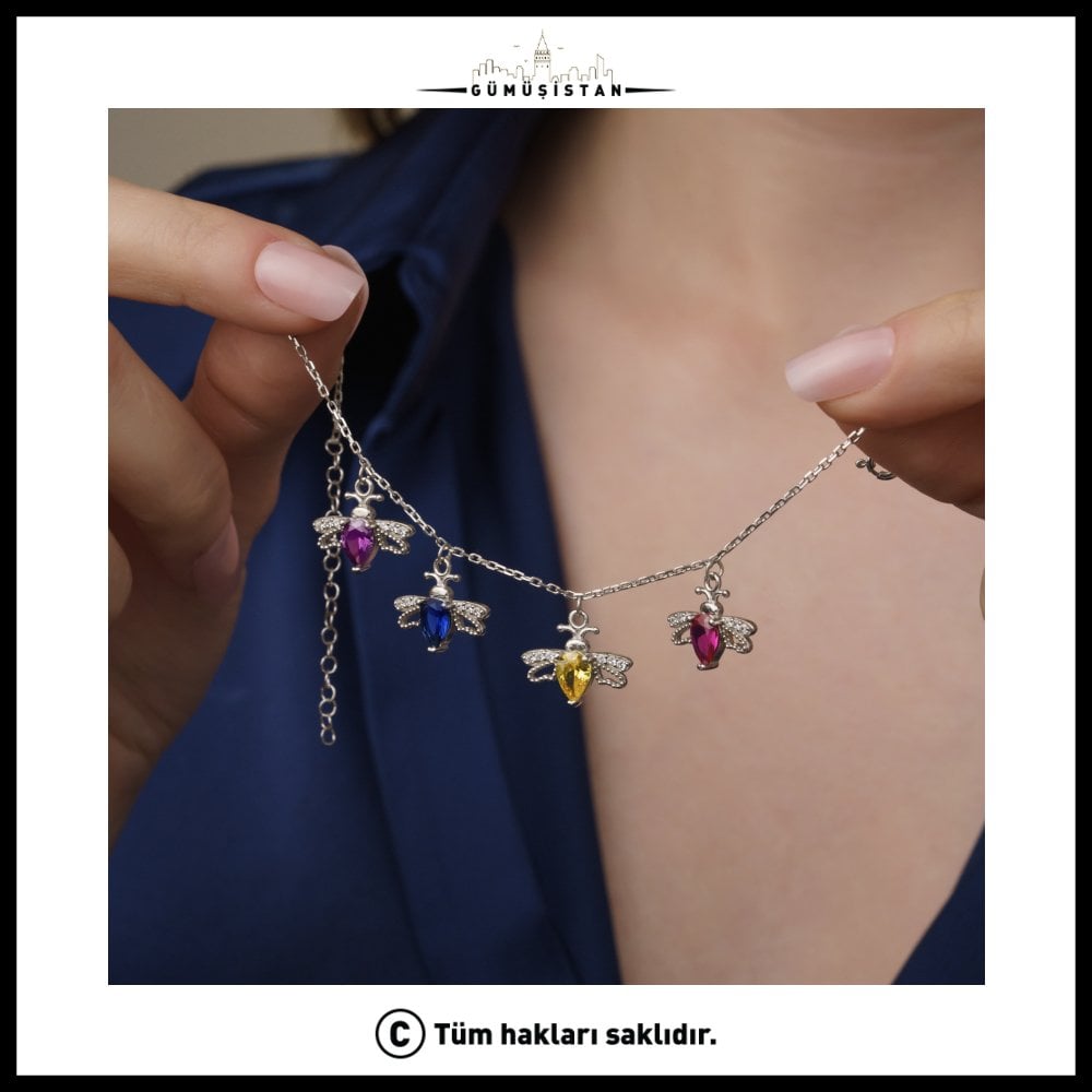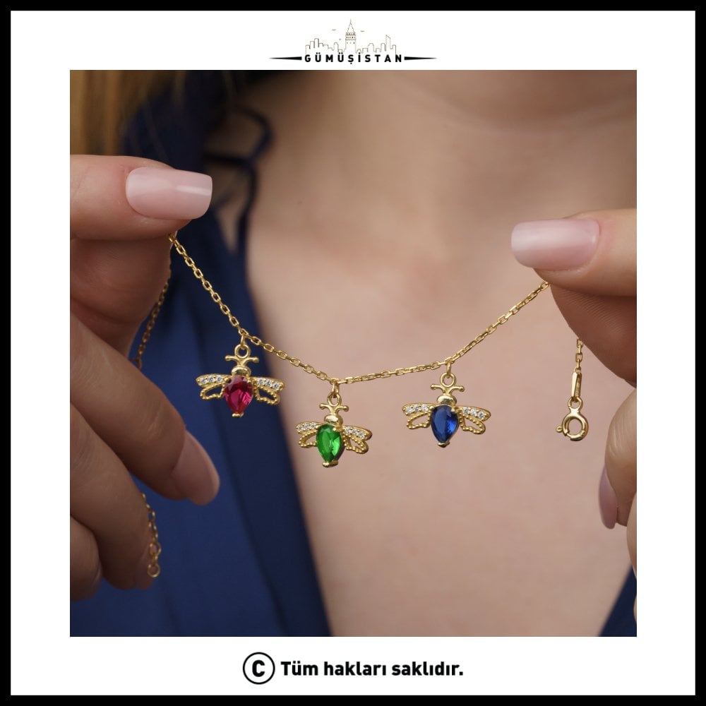 Arı kuşlarının kanat kısımları parlak taş detaylarıyla süslenmiş olup ışıkta göz alıcı bir ışıltı sunar. Damla formundaki doğum taşı ise tasarıma zarif ve modern bir dokunuş katar. İnce ve dayanıklı zinciri sayesinde boyunda hafif bir kullanım sağlar ve gün boyu konfor sunar.