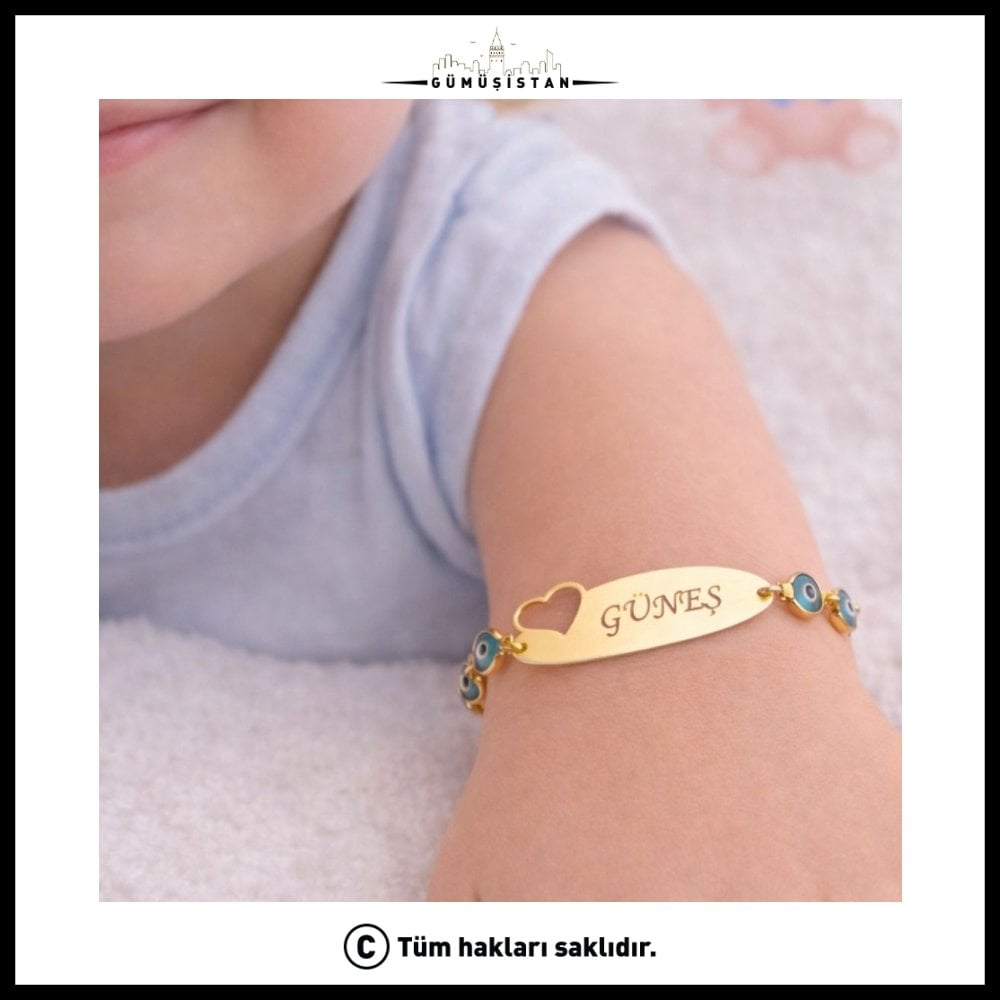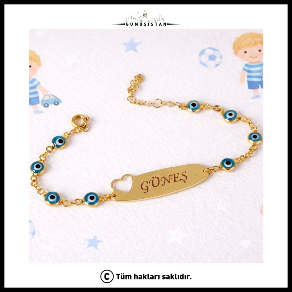 14 Ayar Altın Kaplama Kişiye Özel Nazar Boncuklu Çocuk Bileklik