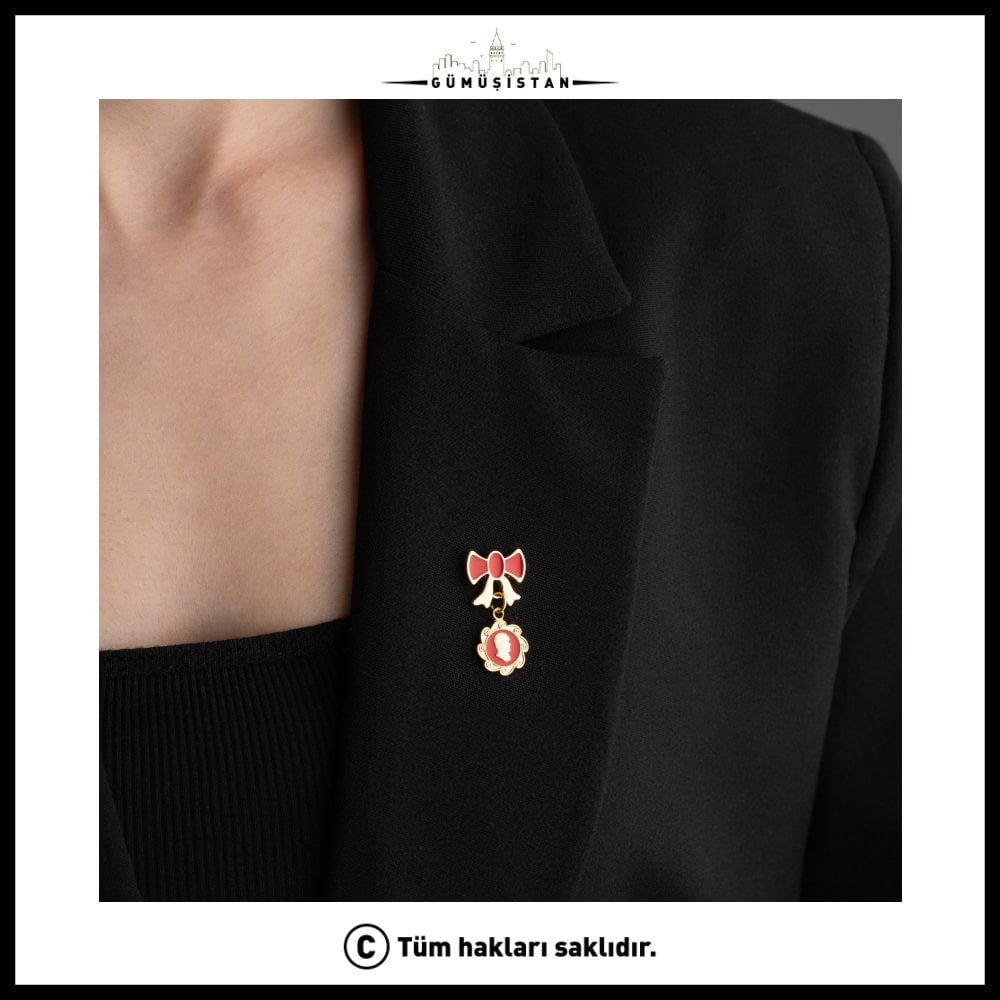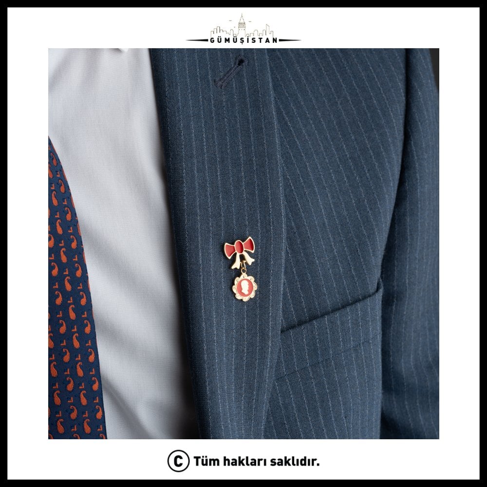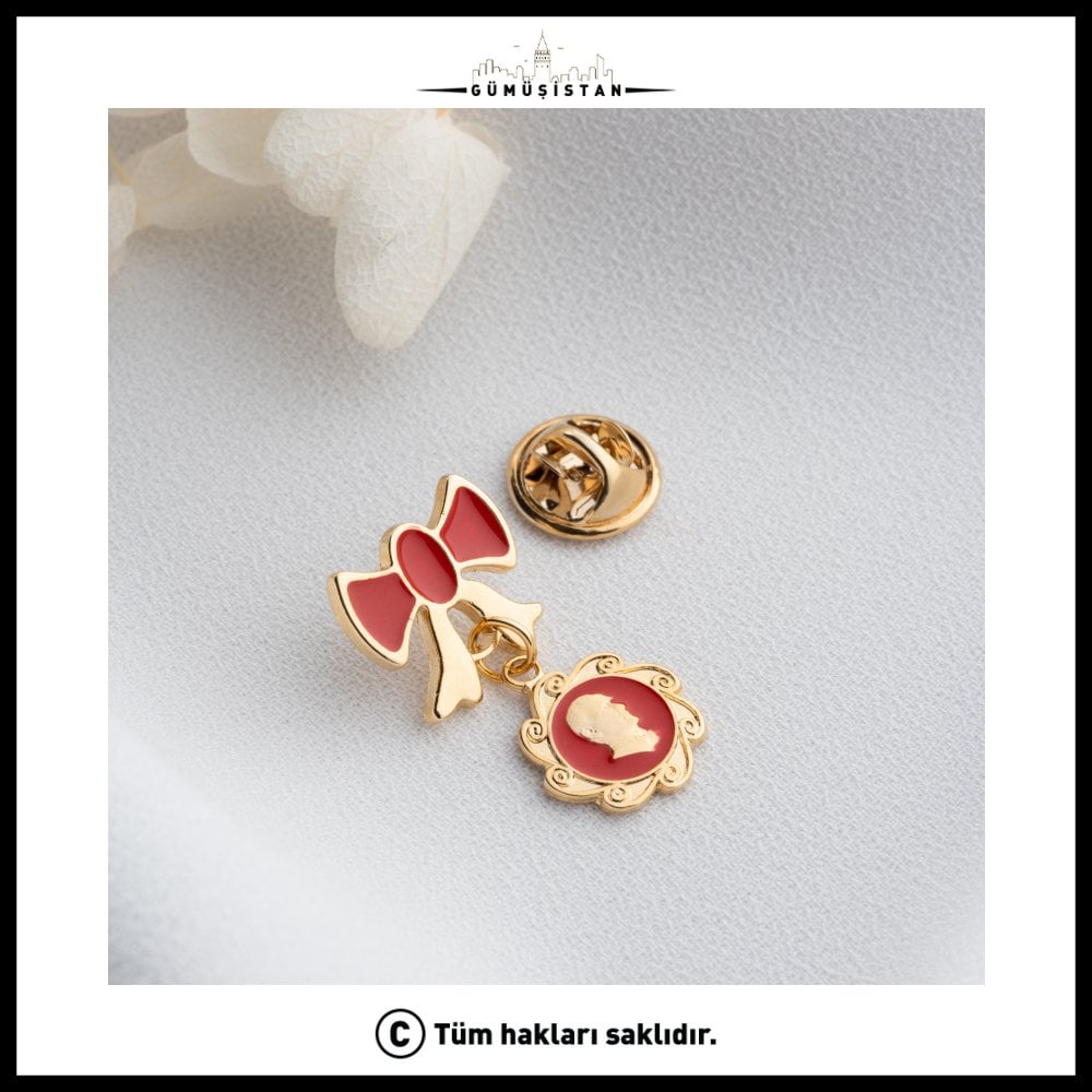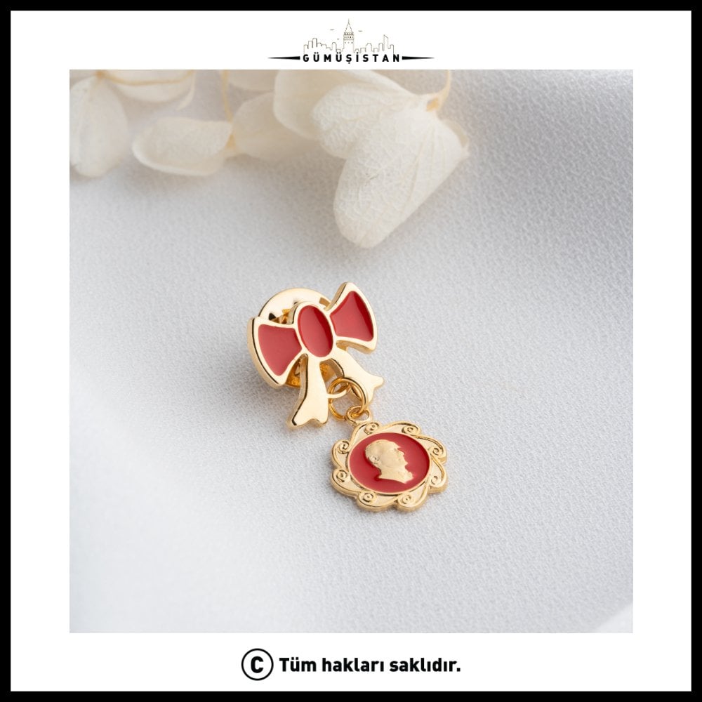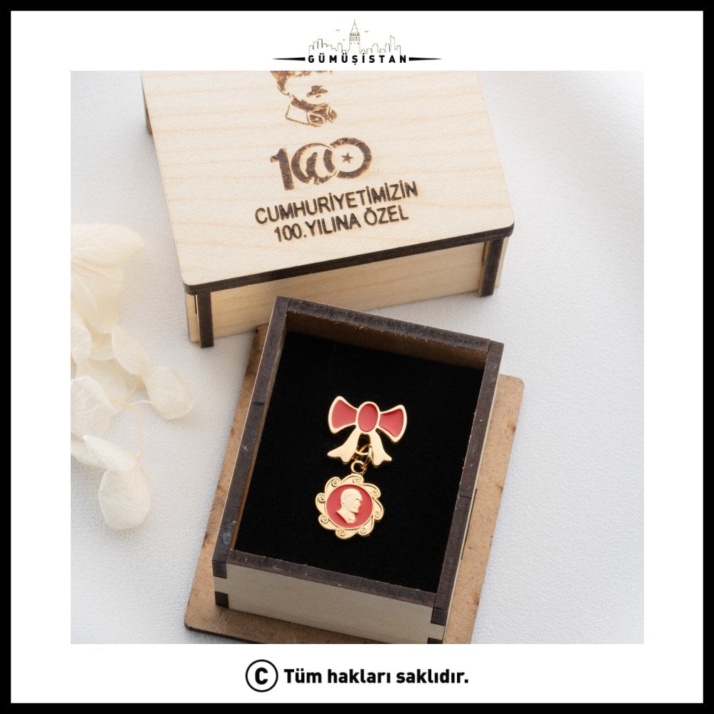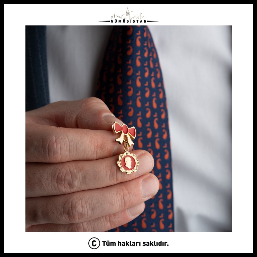 14 ayar altın kaplama bir Atatürk portresi kurdeleli yaka rozeti, Mustafa Kemal Atatürk'ün sembolizmini taşıyan özel bir takı parçasıdır. Atatürk'ün portresini taşıyan bu yaka rozeti, Atatürk'ün Türkiye'nin kurucusu ve modernleştiricisi olarak önemini vurguluyor. Kurdele detayı ise rozetin estetik görünümünü arttırıyor. Türk milli kahramanları ve sembollerini onurlandırmak amacıyla takılmak üzere tasarlanmıştır. Ahşap kutu ile gönderim sağlanmaktadır.