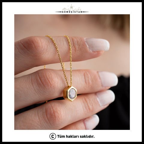 Gümüş işleme sanatını, günümüz modern takı işlemeciliğiyle birleştirerek sizler için özenle tasarladık. Özel Günlerinizde sizi çok daha şık gösterecek Altıgen Tektaş kolyemiz özel Altın kaplaması ile uzun yıllar rengini kaybetmeyecek. Annenize, arkadaşınıza, öğretmeninize, sevgilinize, eşinize sunabileceğiniz değerli bir hediyedir. Size özel hediye mesajlarıyla şık bir hediye kutusu ile özenle hazırlanır.