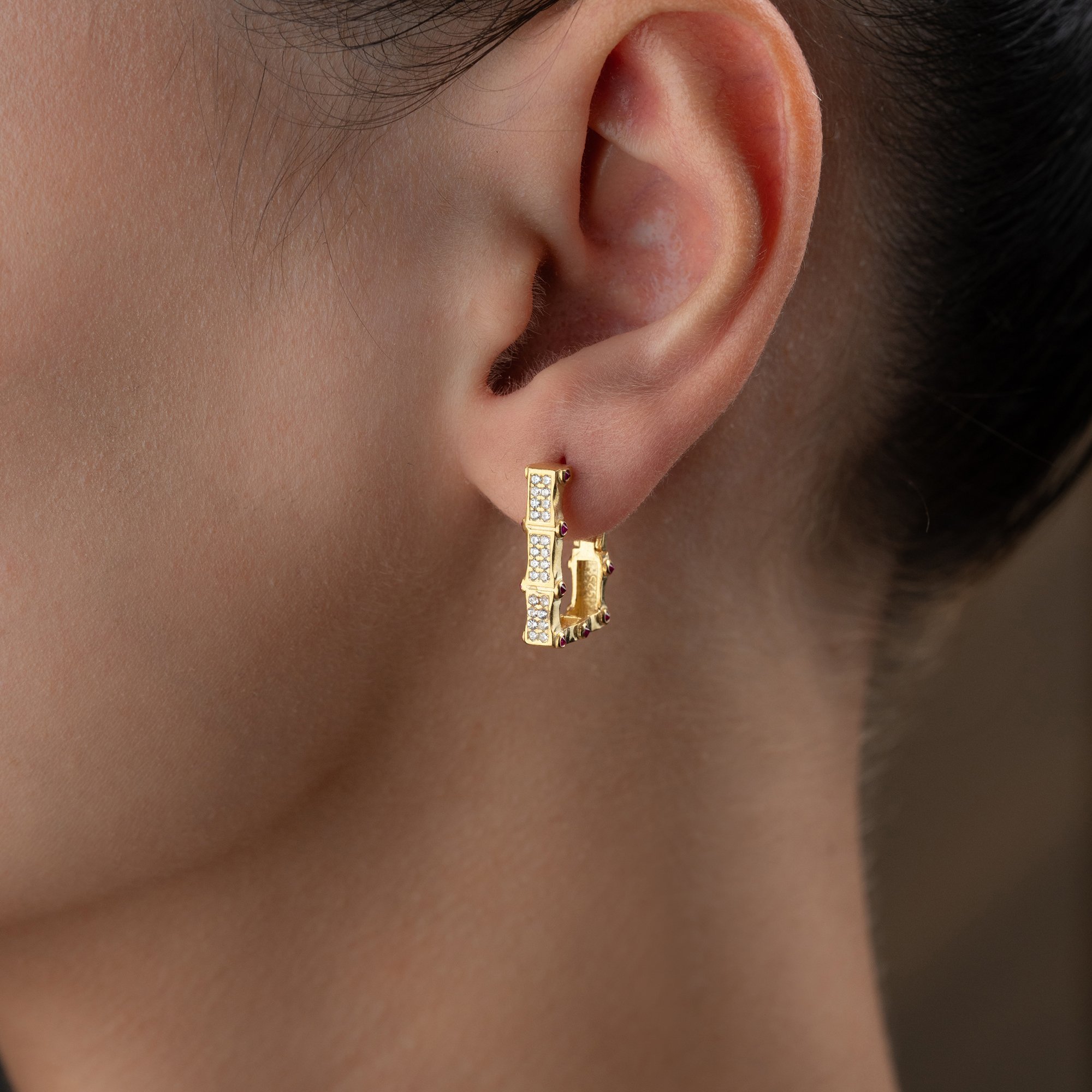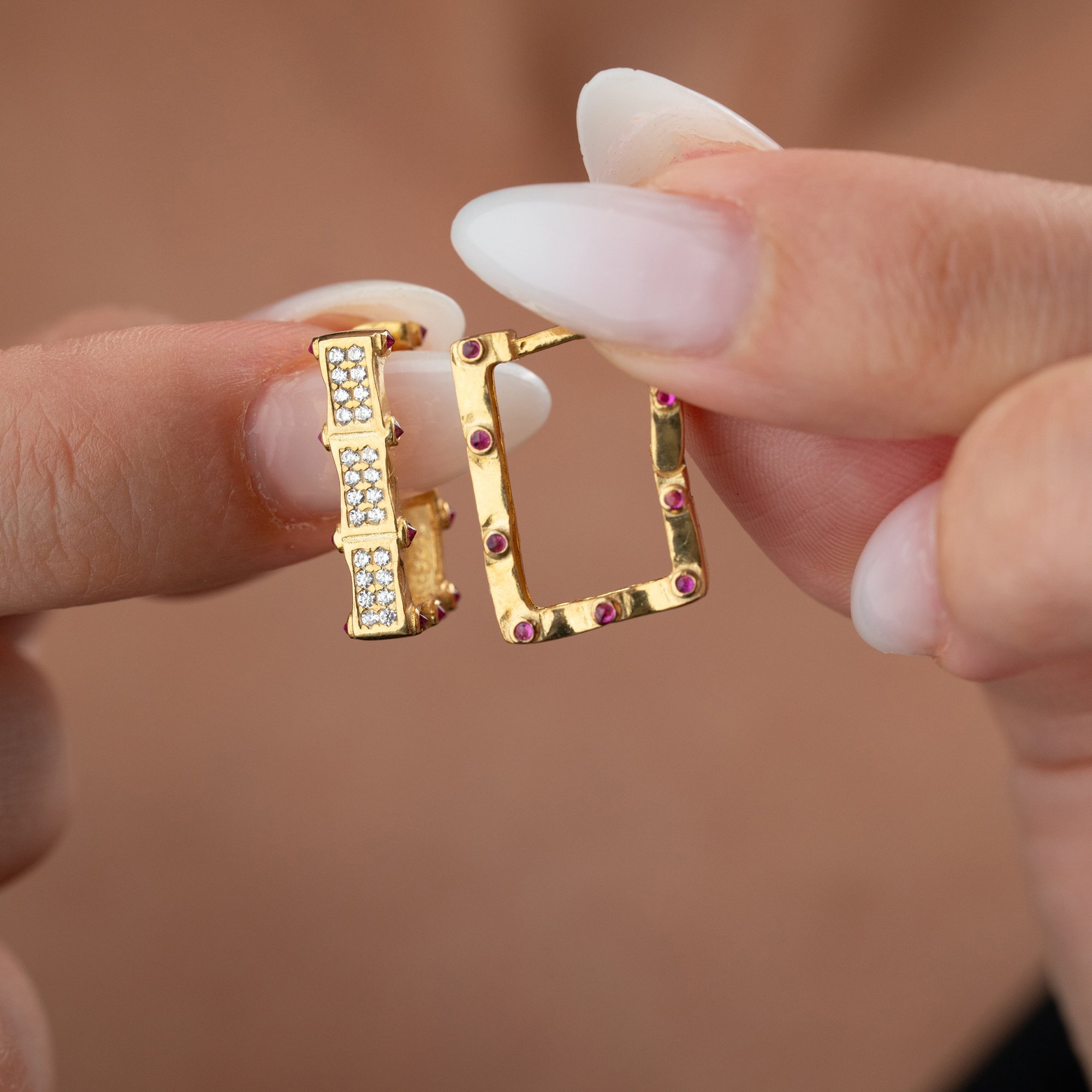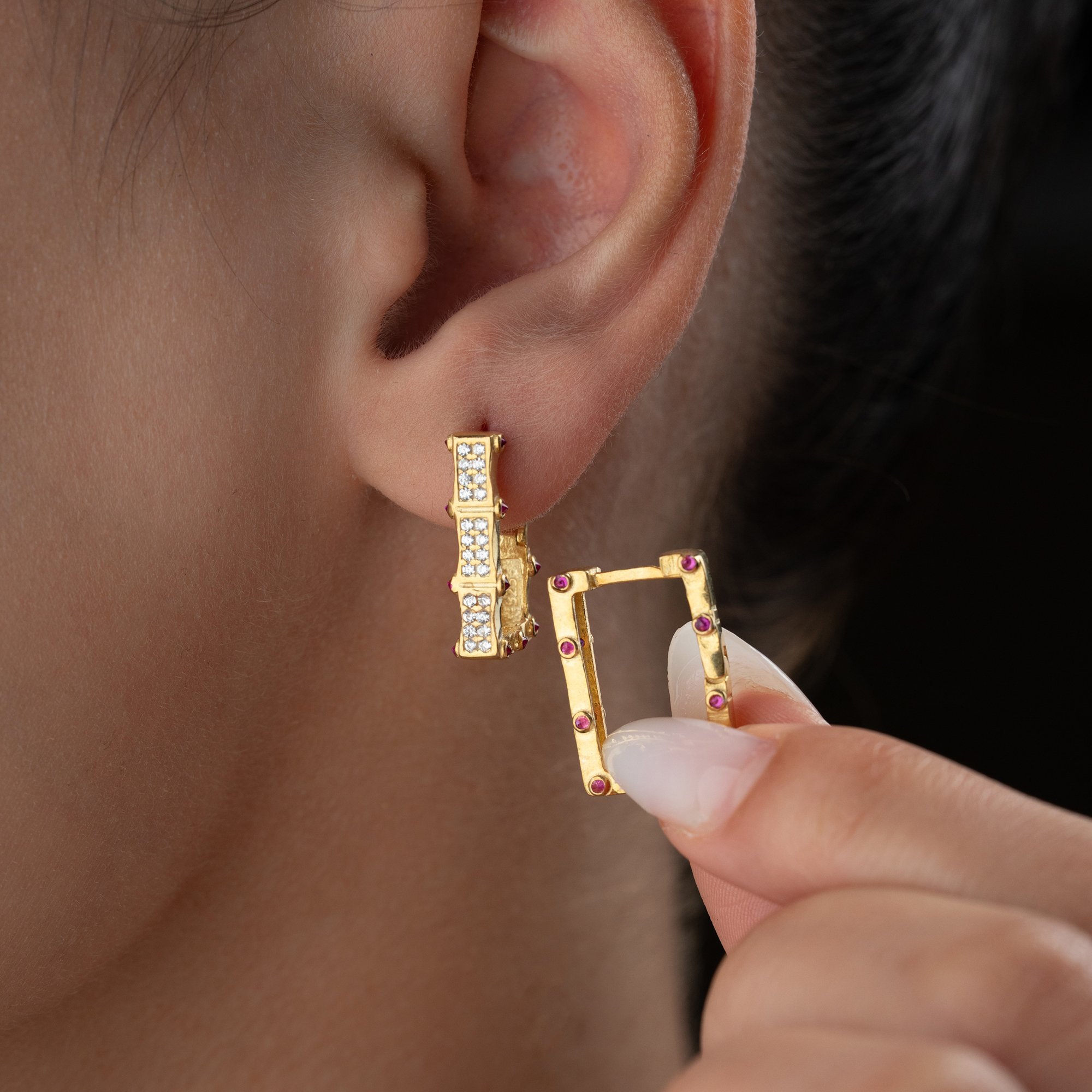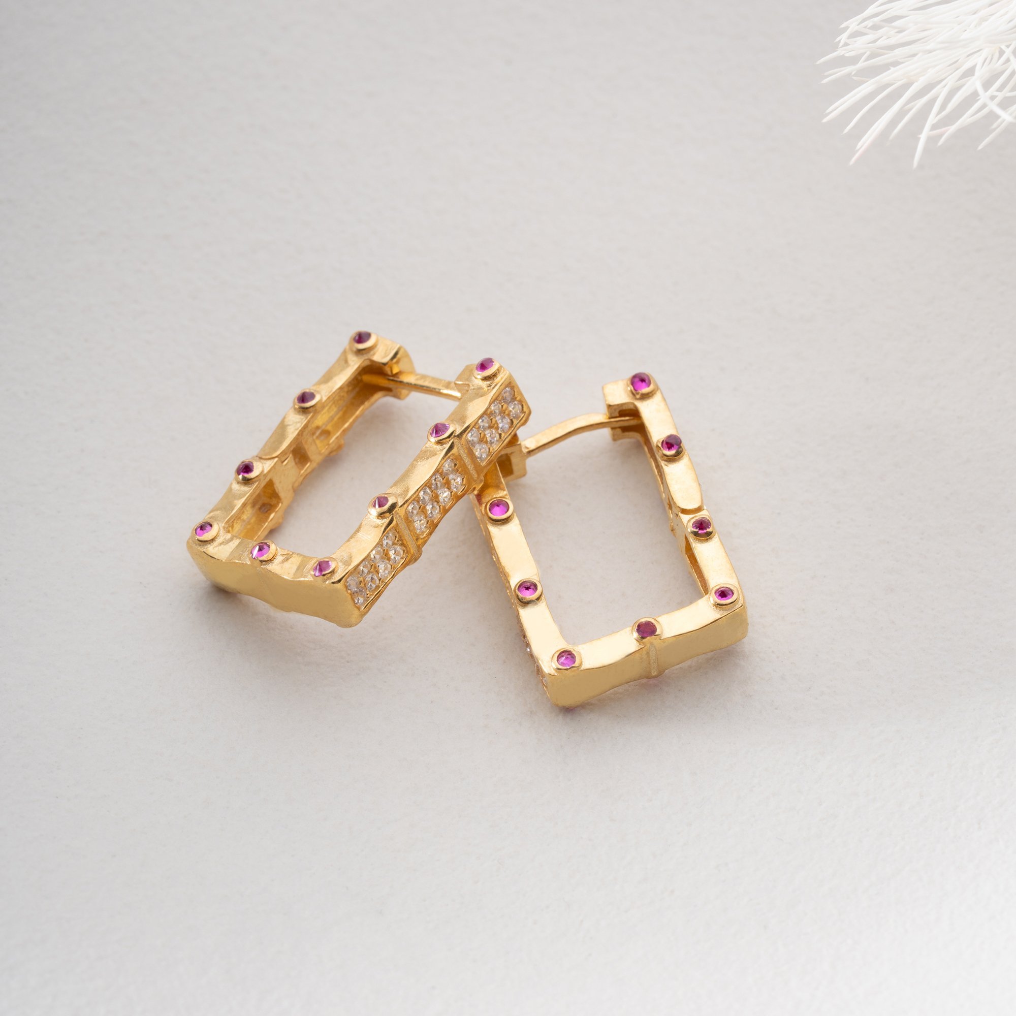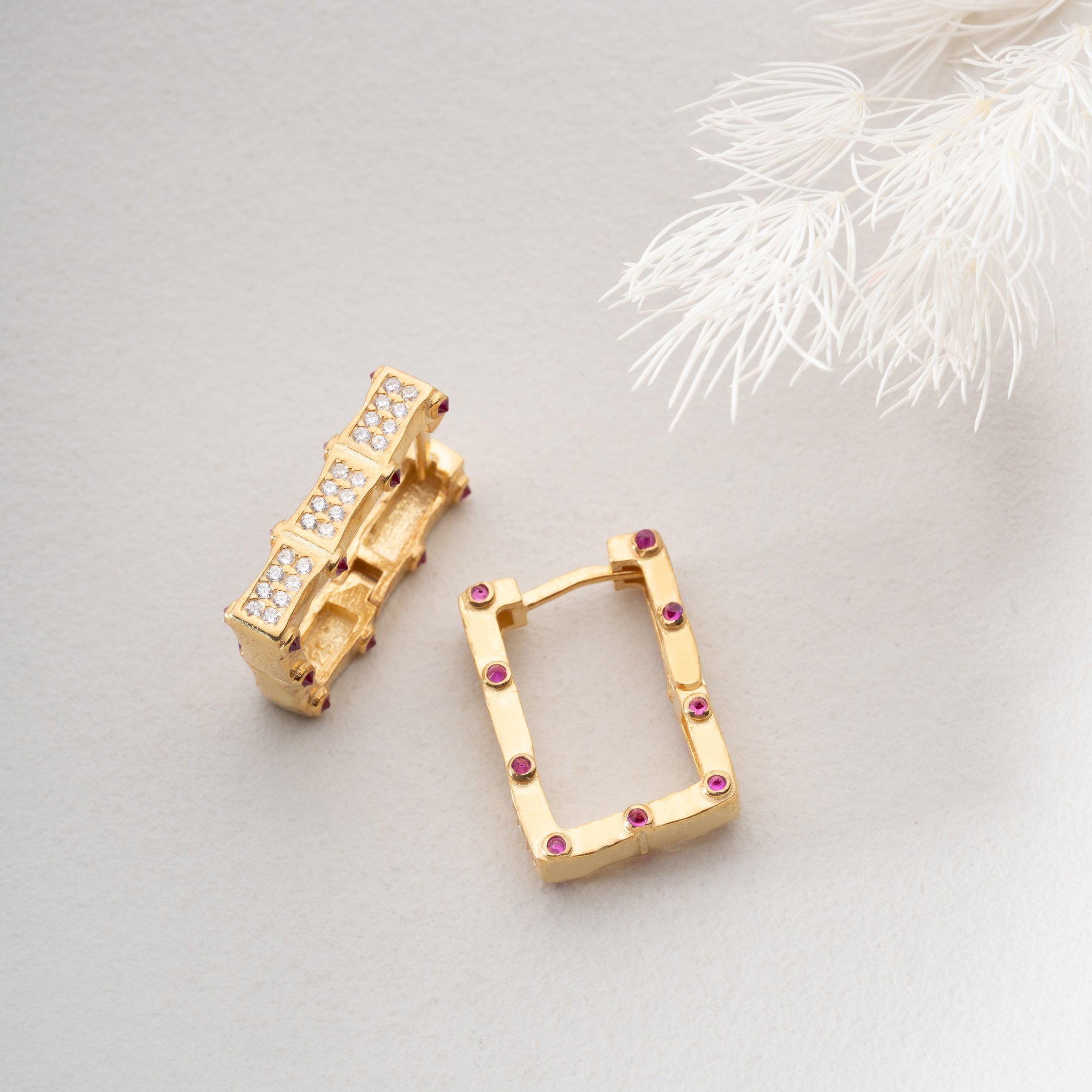 Geometrik hatların zarafetle buluştuğu bu özel tasarım, klasik halka küpe anlayışına modern bir yorum getiriyor. 925 ayar gümüş üzerine yapılan kaliteli altın kaplama, pembe taşların enerjisiyle birleşerek yüzünüze ışıltı katıyor.