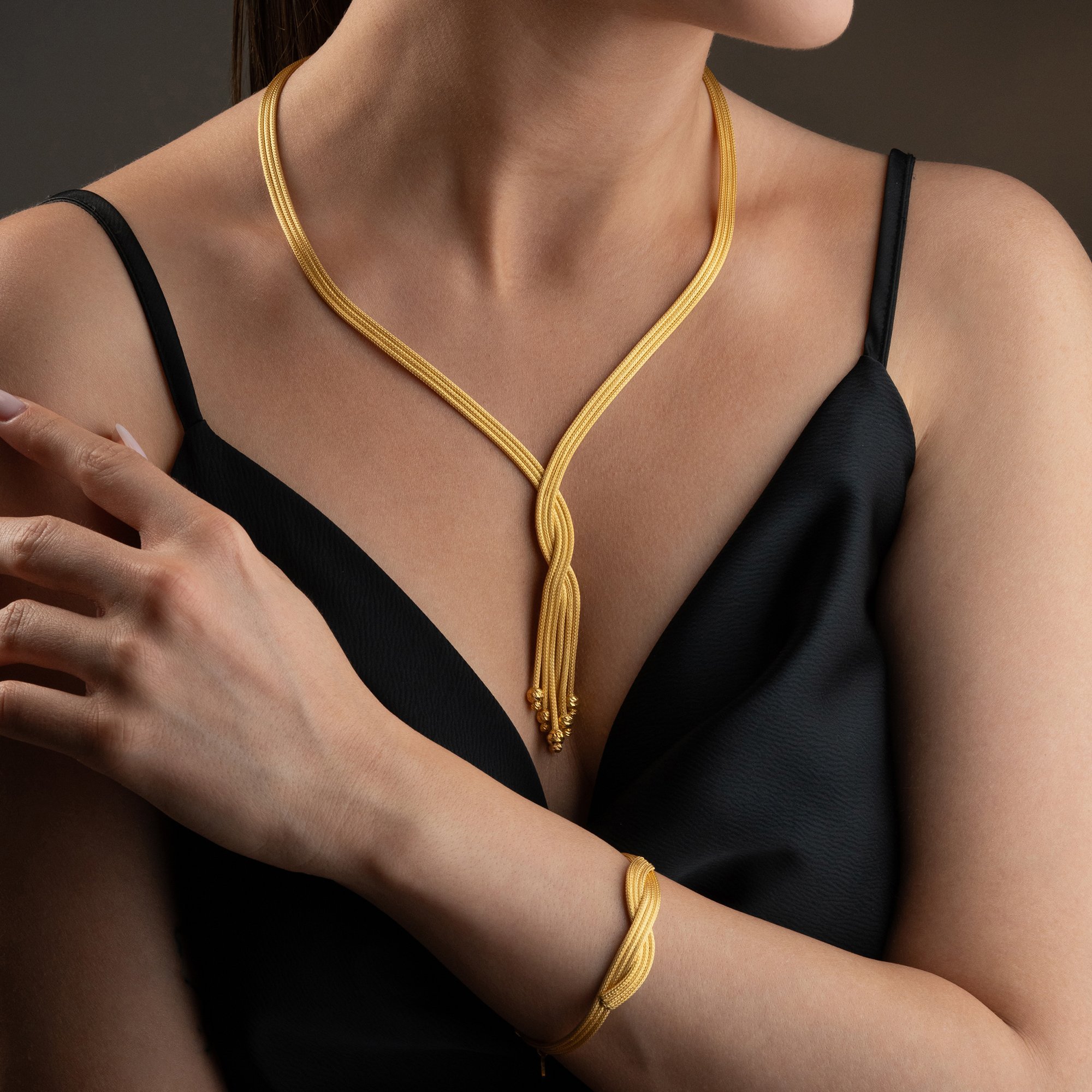 İçerik: Şık bir gerdanlık, uyumlu bir bileklik ve zarif sallantılı küpelerden oluşan tam set.