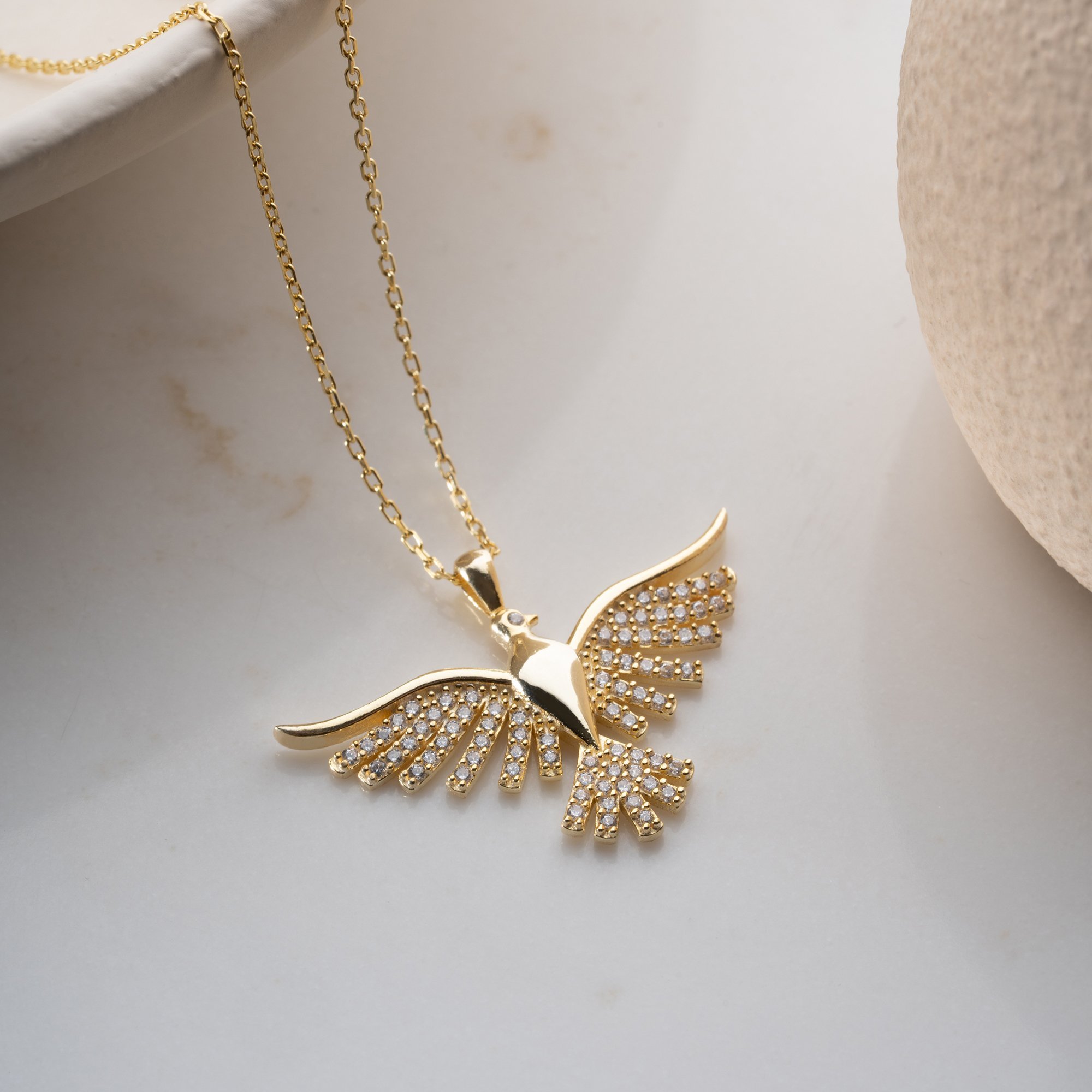Yeniden doğuşun ve gücün simgesi Anka Kuşu, en zarif haliyle boynunuzda ışıldıyor. 925 ayar gümüş üzerine altın kaplama ile tasarlanan bu kolye, detaylarındaki taş işçiliğiyle göz kamaştırıyor.