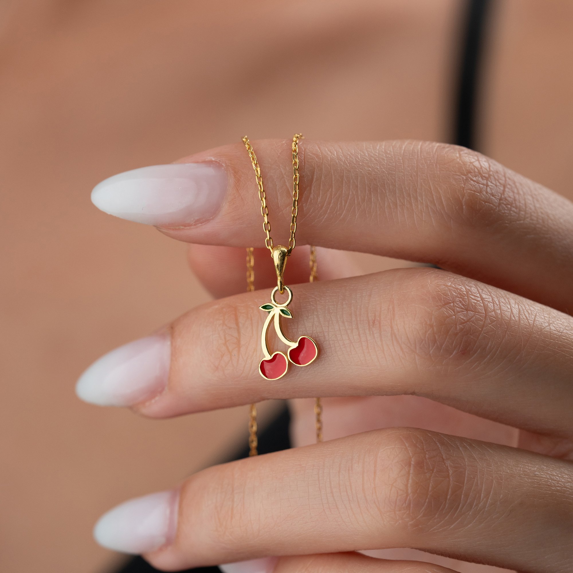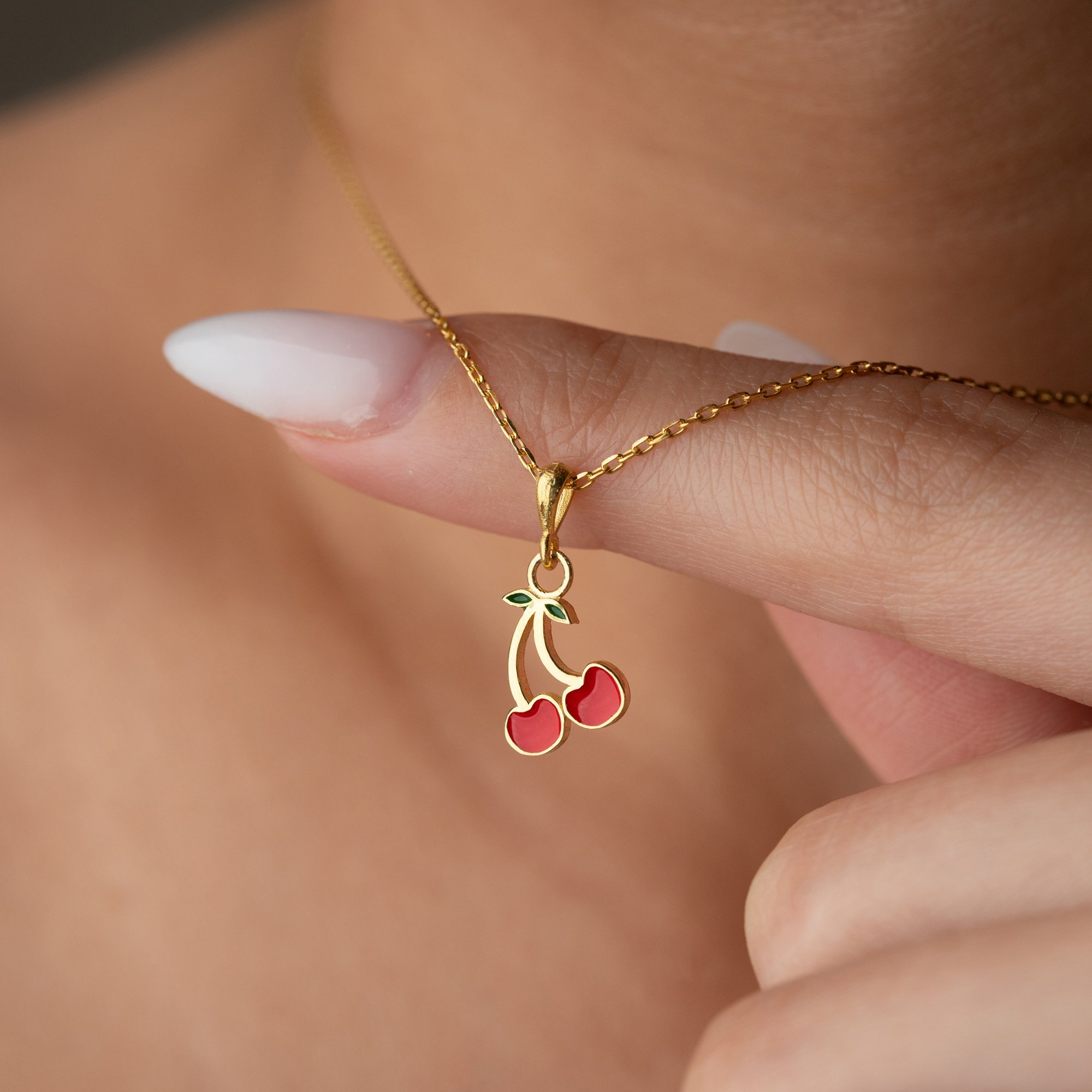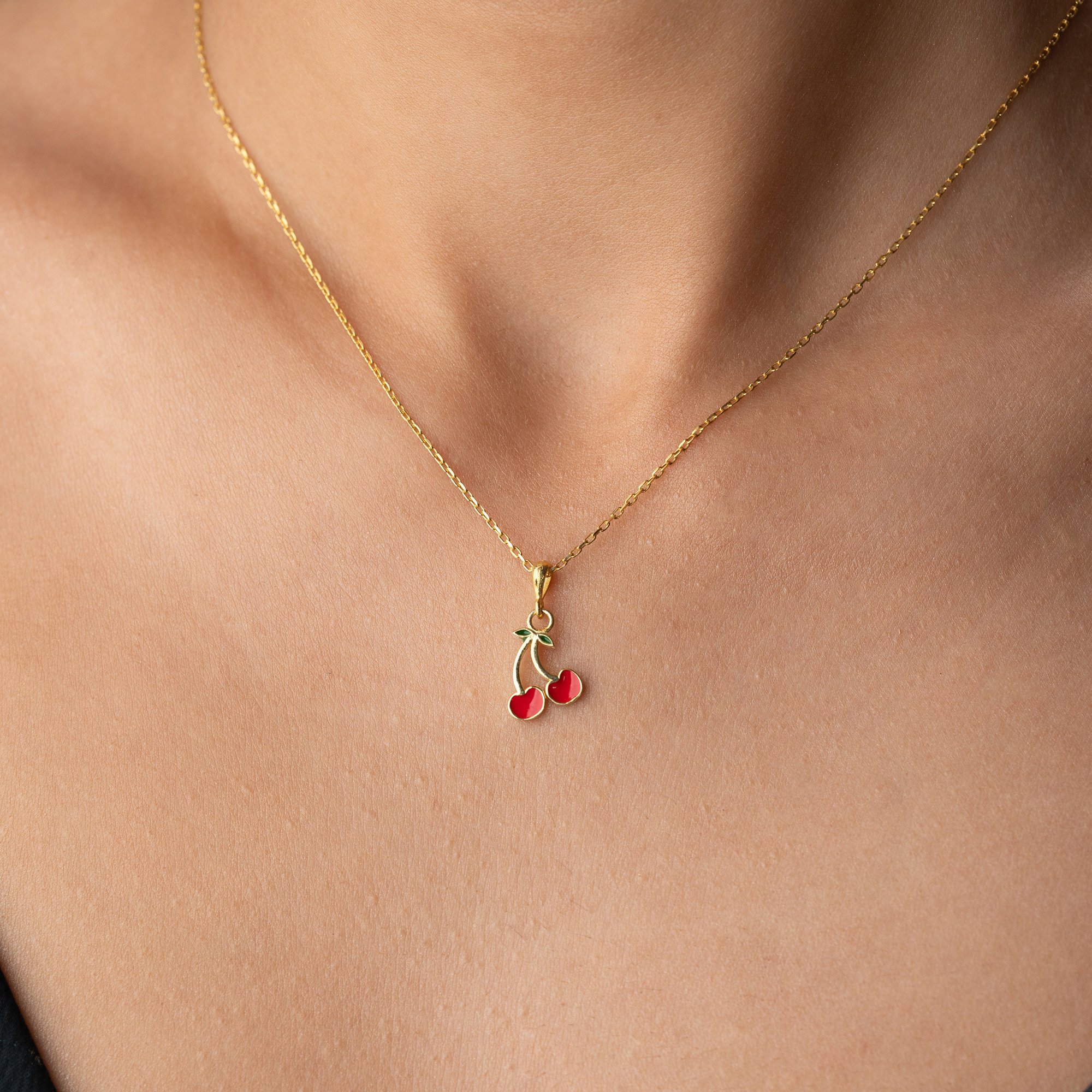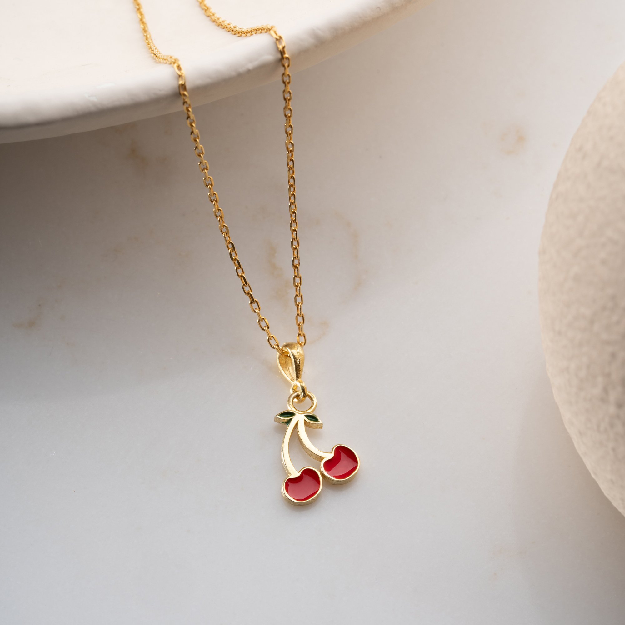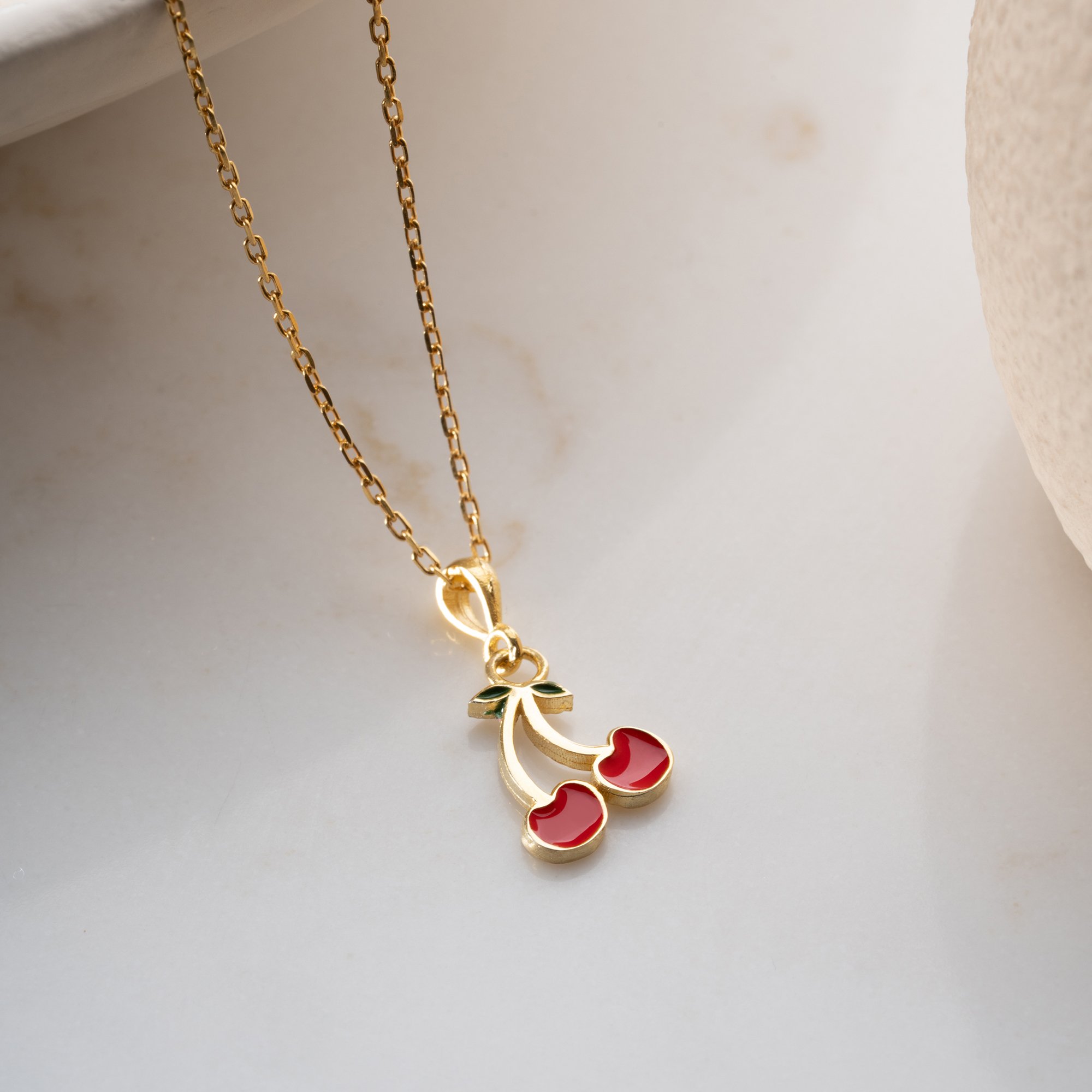 Tasarım: İkili kiraz formunda, canlı kırmızı mine (enamel) işçiliği ve minik yeşil yaprak detayıyla hazırlanan estetik figür.
