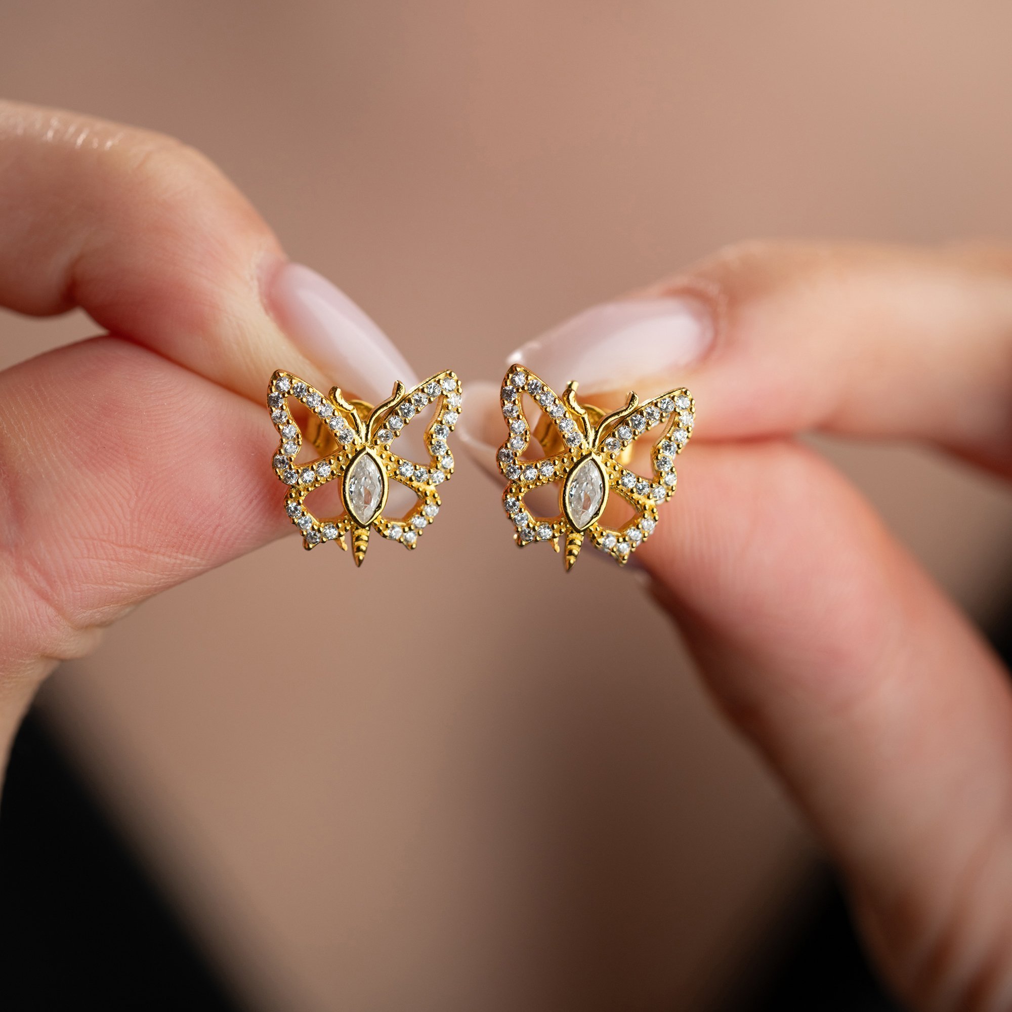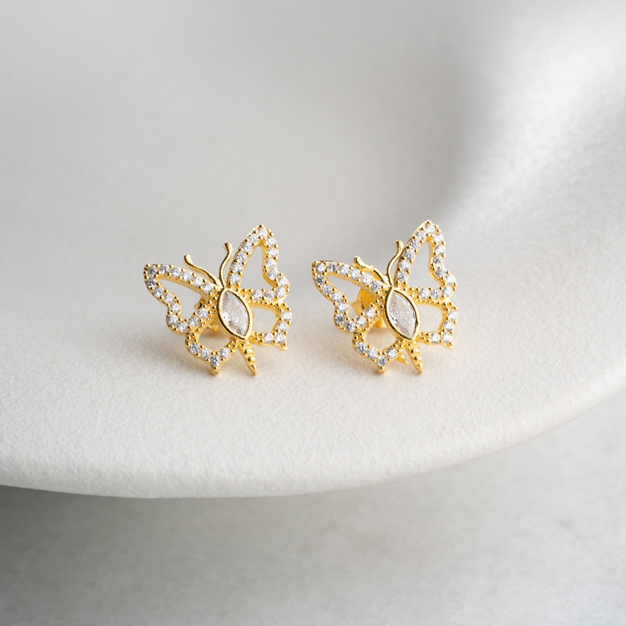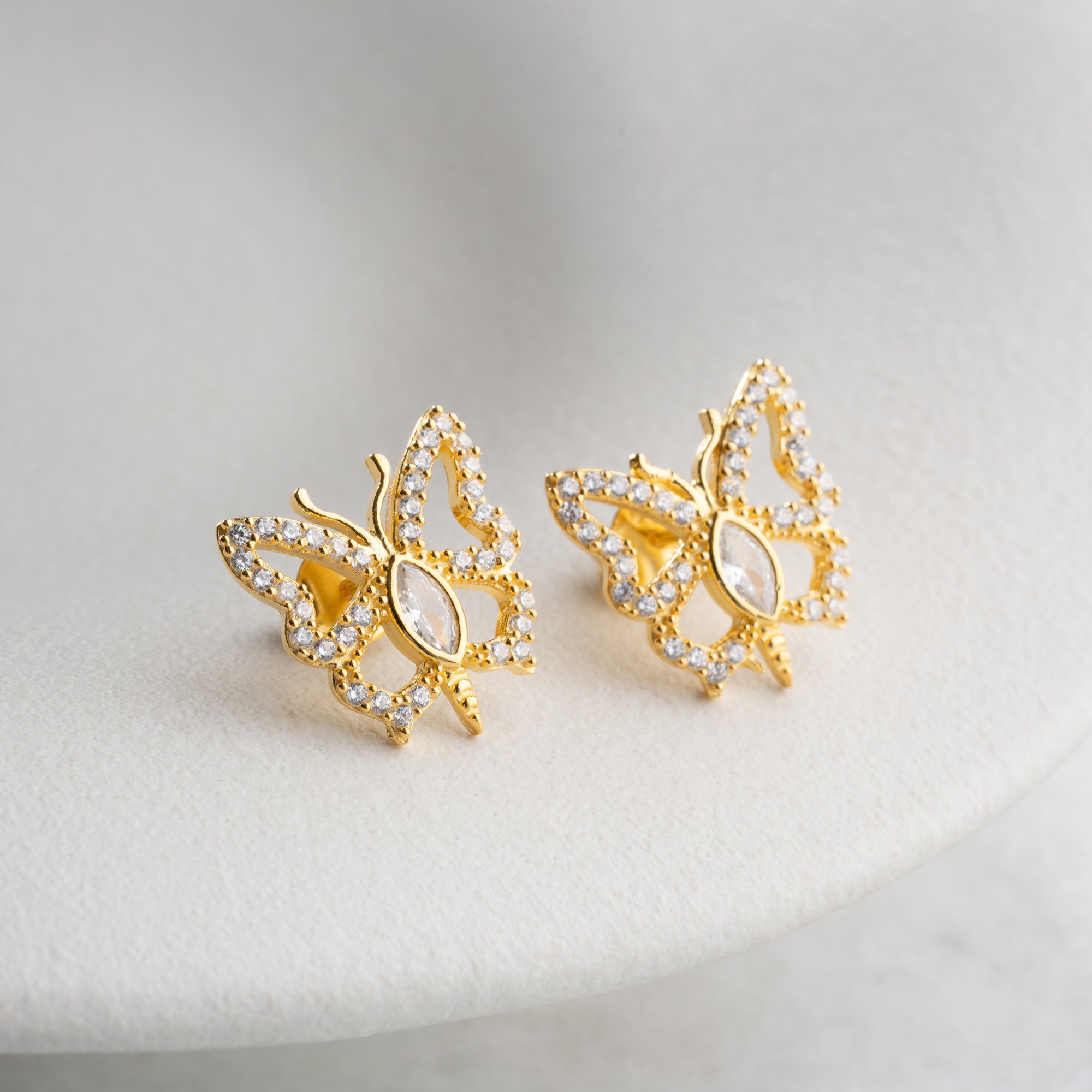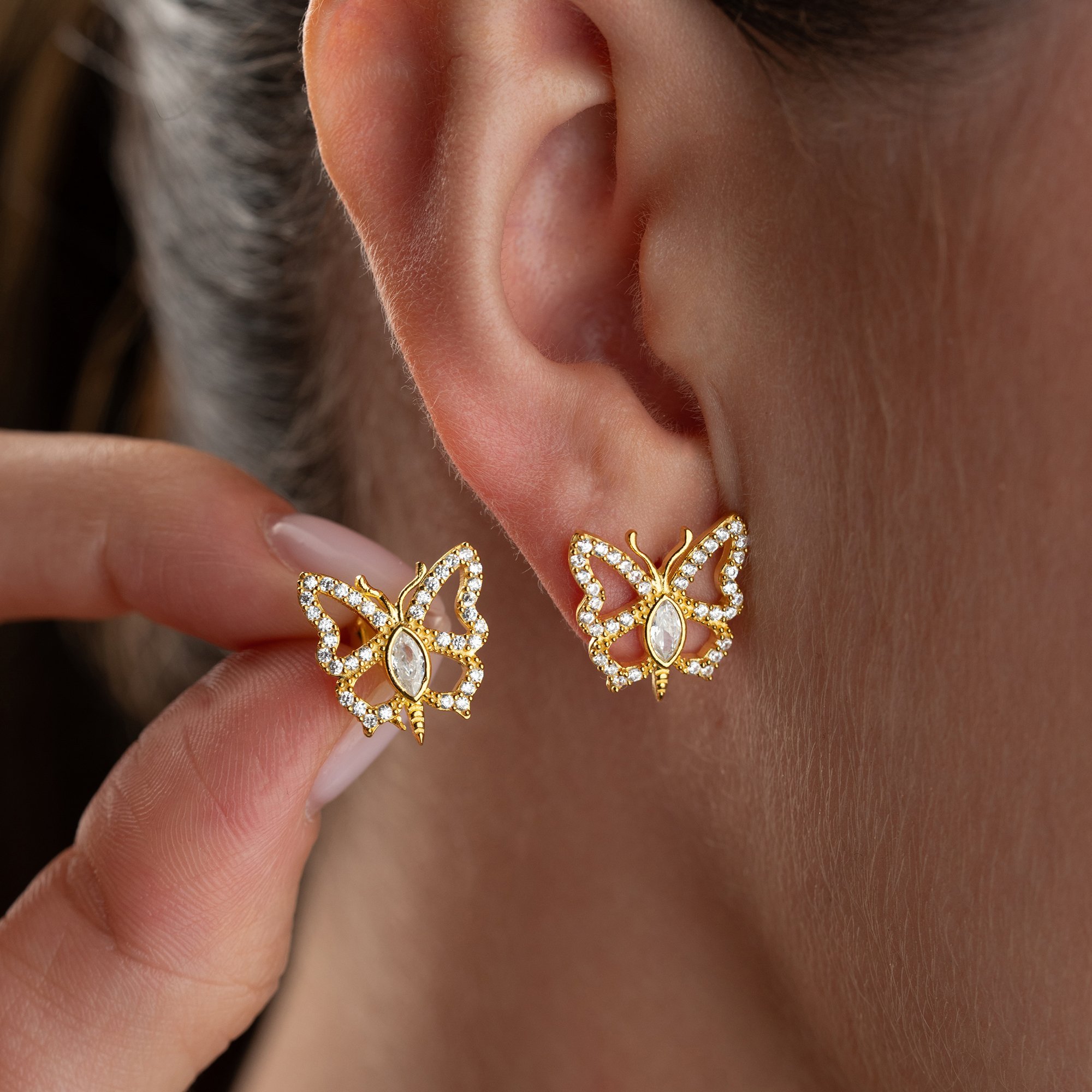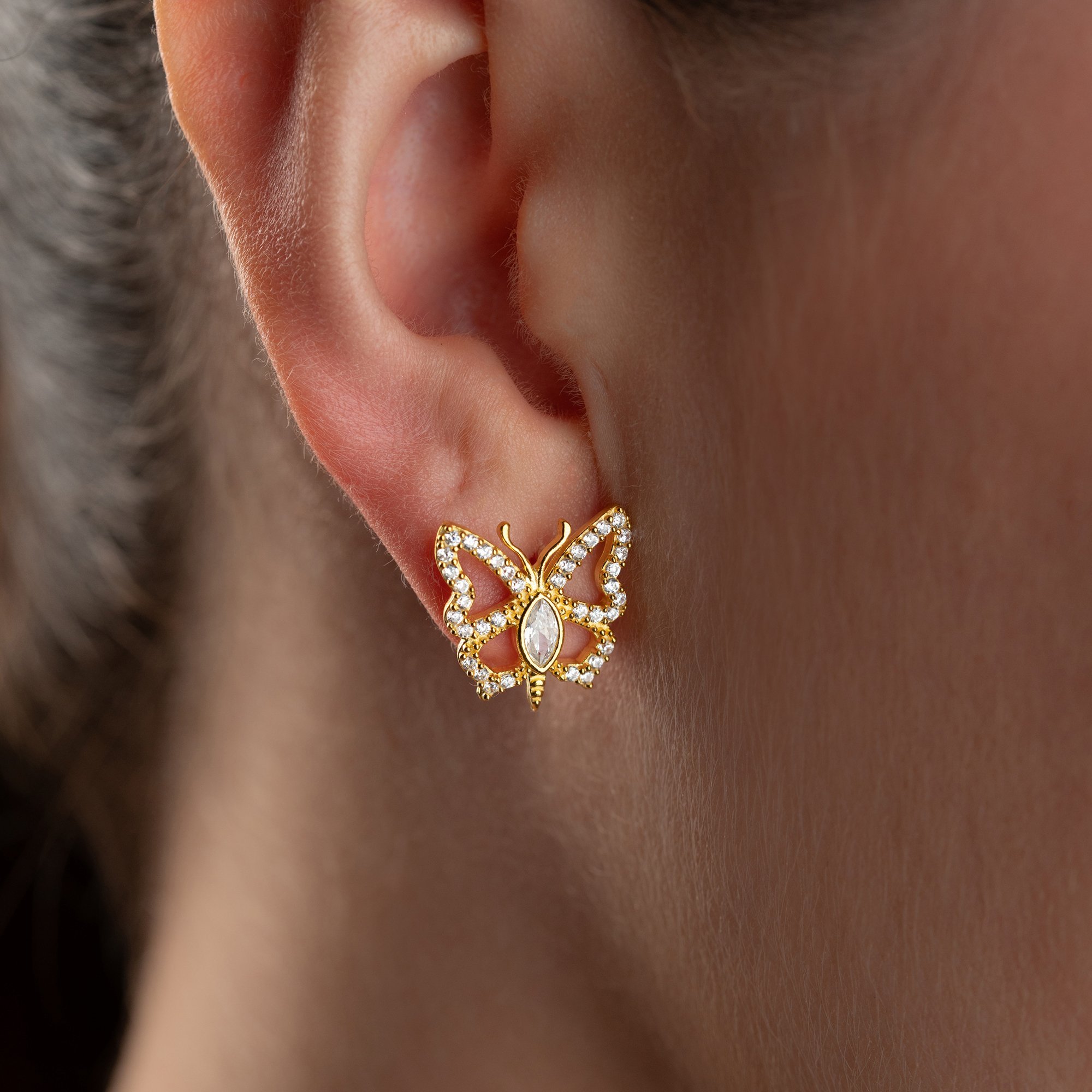 Doğanın en zarif sembolüyle stilinize kanat açın. 925 ayar gümüş üzerine yüksek kaliteli altın kaplama ile tasarlanan bu küpeler, kelebeklerin narin formunu ışıltılı detaylarla birleştiriyor.