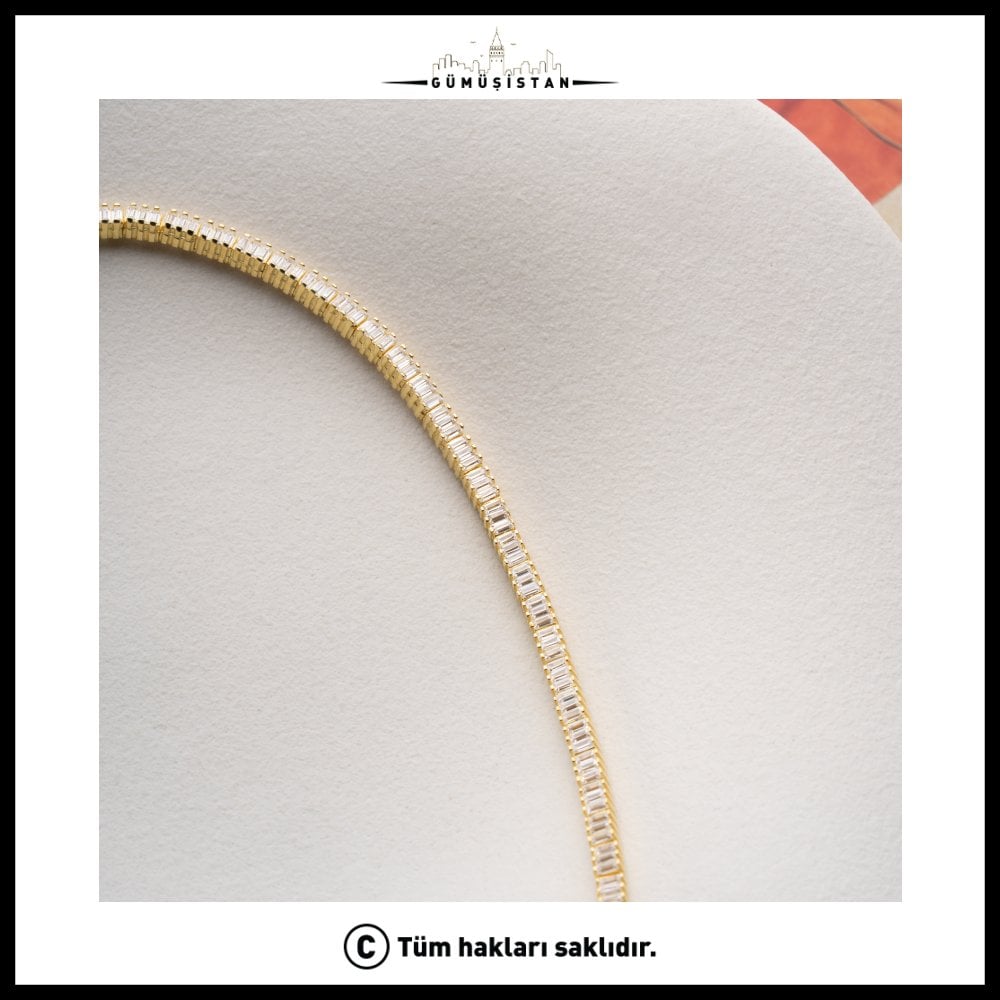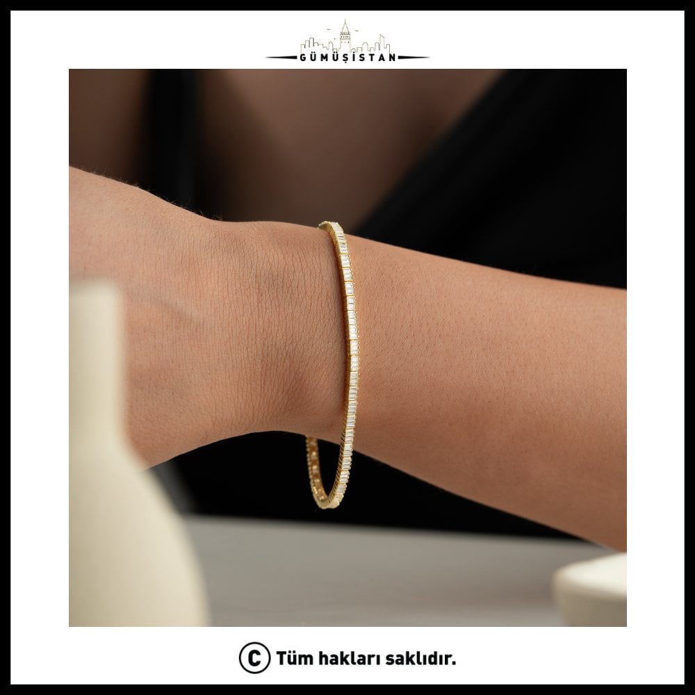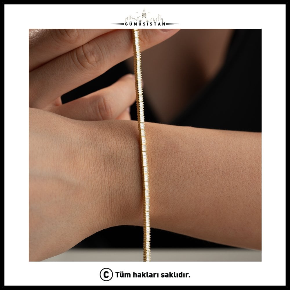 Işıltının kesintisiz akışı… Baget kesim taşların yan yana dizilmesiyle oluşturulan suyolu tasarım, bileğinde zarif ve etkileyici bir parlaklık sunar. 925 ayar gümüş üzerine özenle yerleştirilen baget taşlar, modern ve sofistike bir görünüm kazandırırken klasik şıklığı da beraberinde getirir.