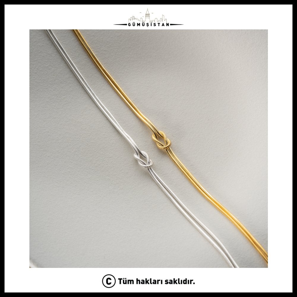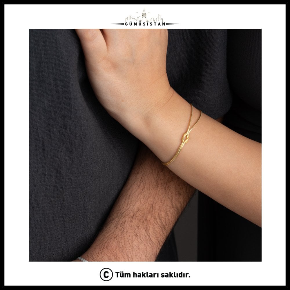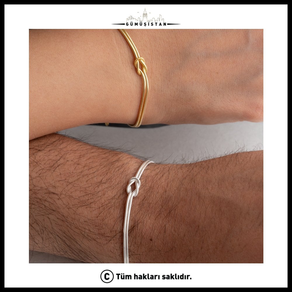 Sadeliğin en anlamlı hali… Bu özel tasarım bileklik, ortasında yer alan zarif düğüm detayı ile bağlılığı, sonsuzluğu ve güçlü bağları simgeler. 925 ayar gümüşten üretilen bu bileklik, hem gümüş hem de altın kaplama seçenekleriyle zamansız bir şıklık sunar.