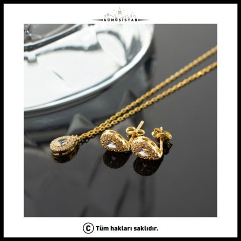 925 Ayar Gümüş Damla Taşlı Kolye-Küpe Seti