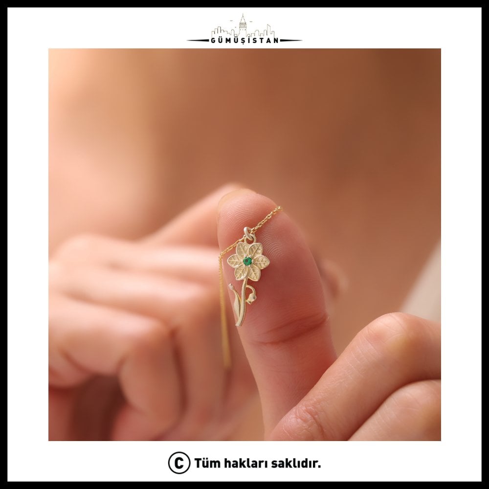 Doğanın tazeliğini ve zarafetini simgeleyen müge çiçeği, 925 ayar saf gümüşle buluşuyor. Üzerinde Mayıs ayının doğum taşı olan zümrüt taşıyla taçlandırılan bu özel kolye, taşıyan kişiye sevgi, bereket ve içsel huzur getirir.