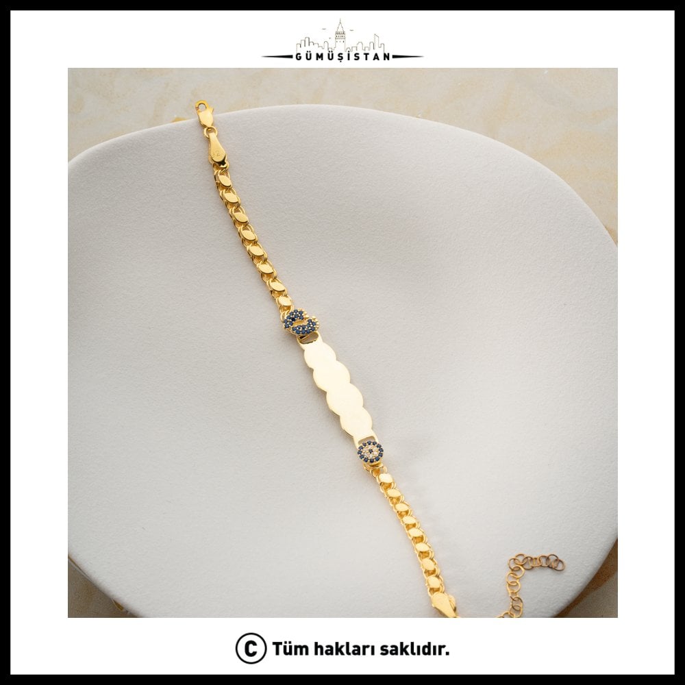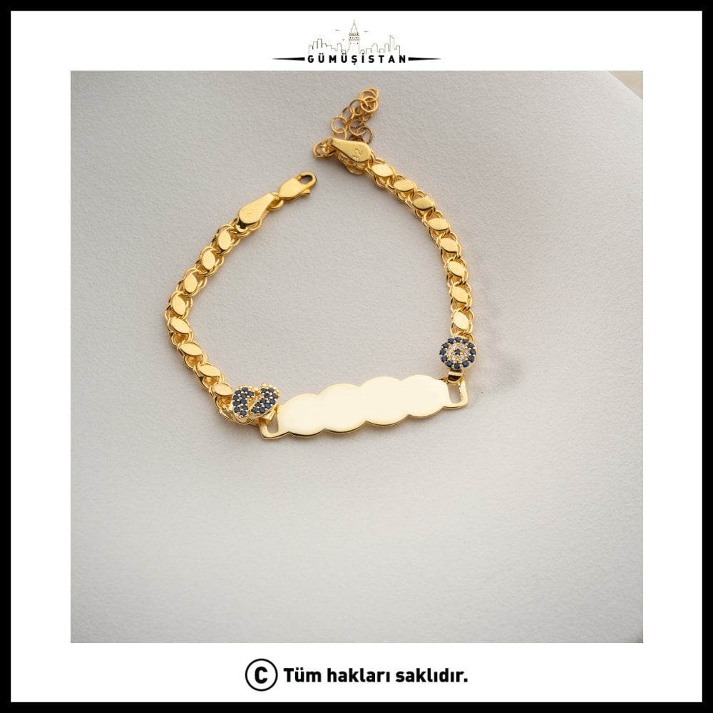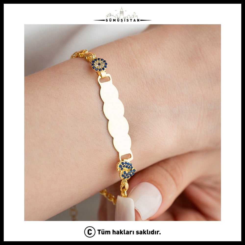 Zarif ve anlam yüklü detaylarıyla öne çıkan bu özel tasarım bileklik, hem şıklığı hem de anlamı bir arada sunar. 925 ayar gümüş üzerine altın kaplama olarak üretilen bu bileklik; ortasında yer alan isim yazılabilir plakası, nazar boncuğu taşlı detayları ve kalp figürü ile dikkat çeker.