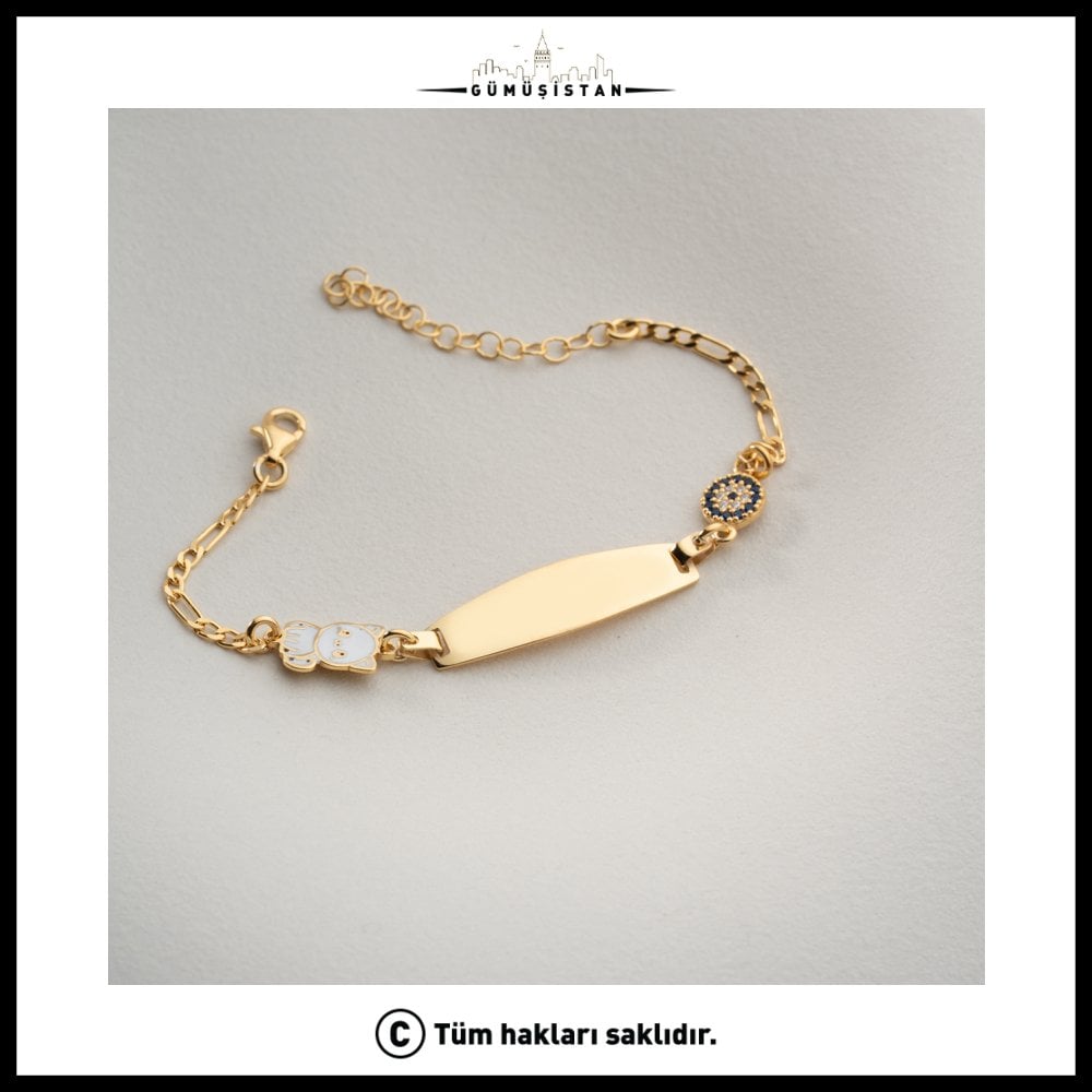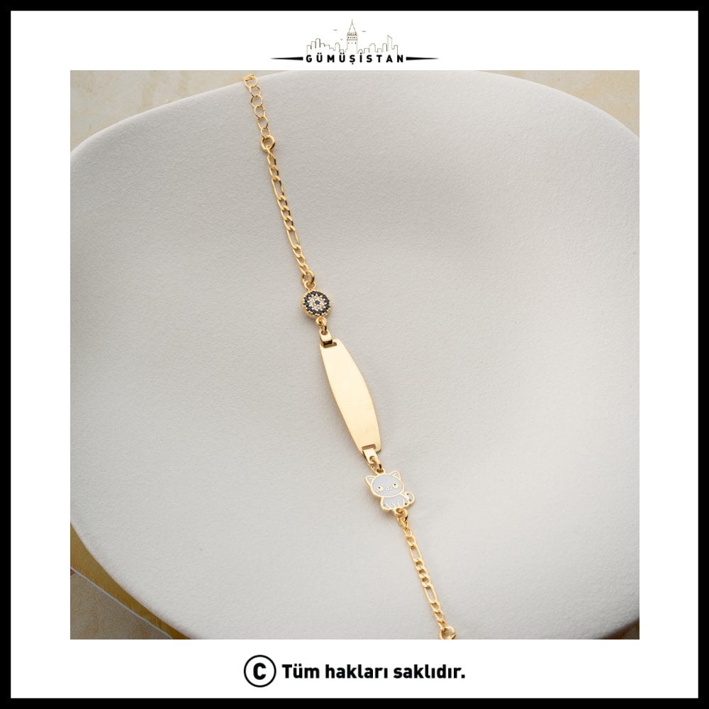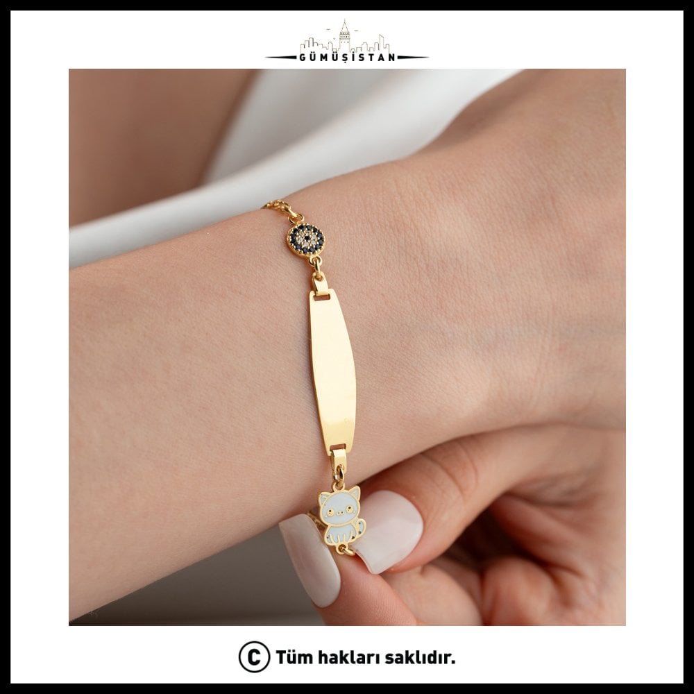 Sevimlilik ve anlamın bir araya geldiği bu özel tasarım bileklik, zarif detaylarıyla dikkat çeker. 925 ayar gümüş üzerine altın kaplama olarak üretilen bu bileklik; ortasında yer alan sade isimlik plakası, nazar boncuğu detayı ve minik kedi figürü ile hem şık hem de eğlenceli bir görünüm sunar.