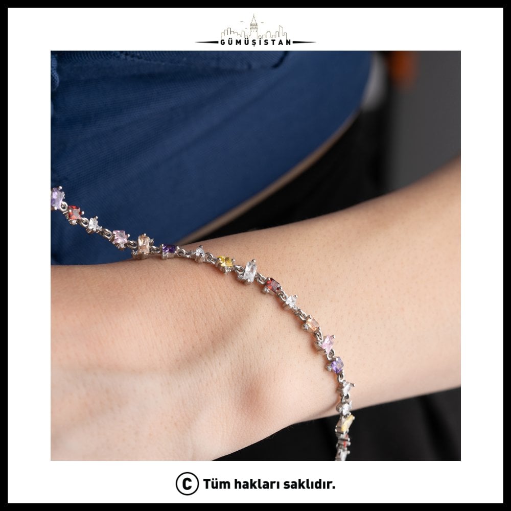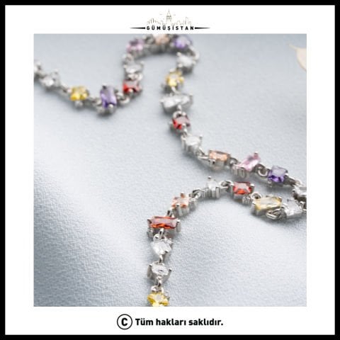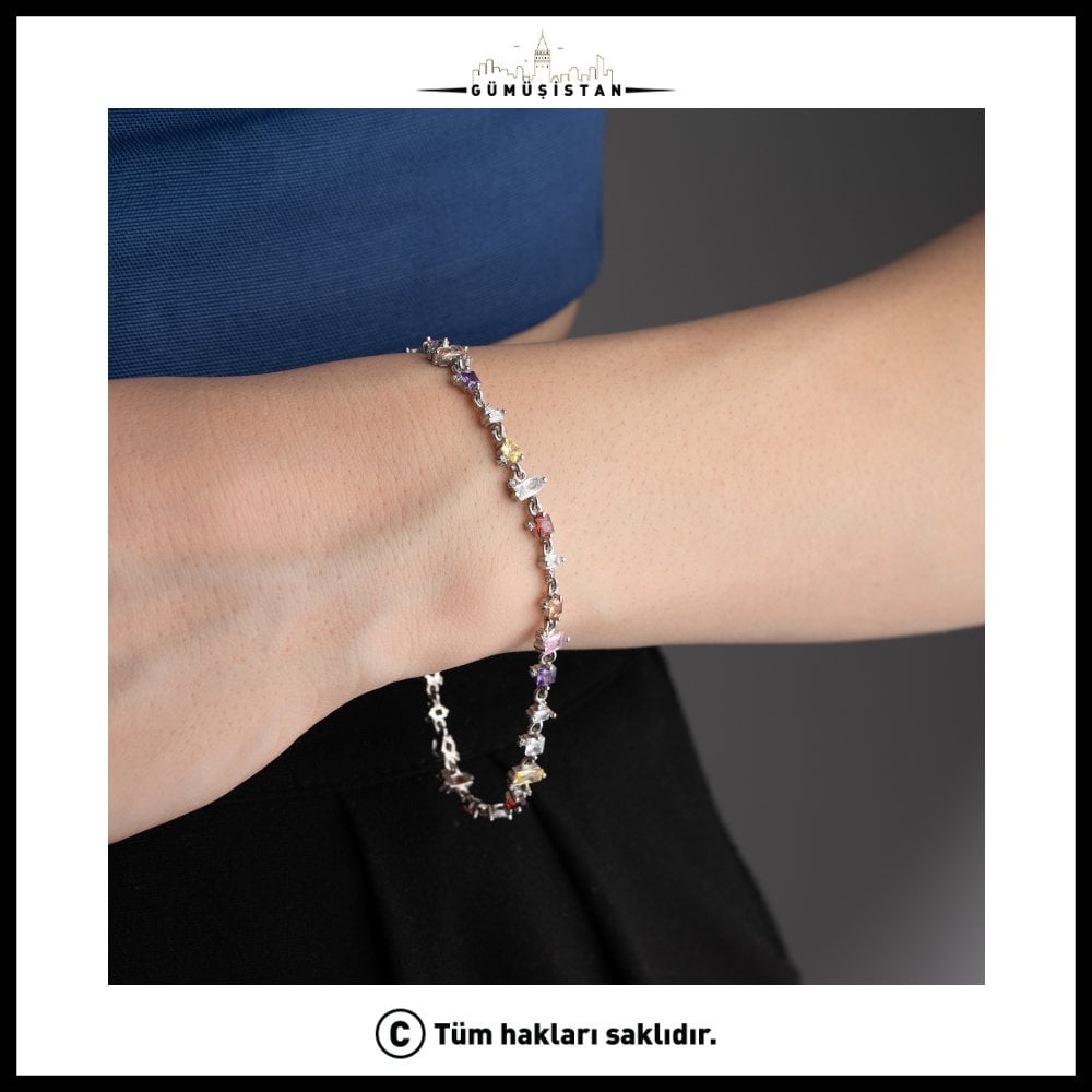 Şıklığınızı ve zarafetinizi taçlandıracak bu güzel bilekliğimiz özel günlerinizin vazgeçilmezi olacak nadide bir parçadır. Renkli taşlarla bezenmiş zirkon taşların ışıltısıyla bütün gözleri üzerinize çekecek, kendinizi özel hissedeceksiniz. Annenize, arkadaşınıza, öğretmeninize sevgilinize, eşinize sunabileceğiniz değerli bir hediyedir. Size özel hediye mesajlarıyla şık bir hediye kutusu ile özenle hazırlanır.