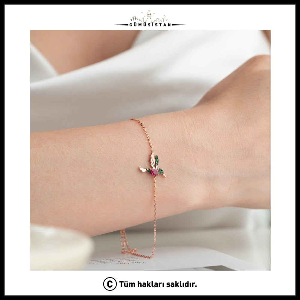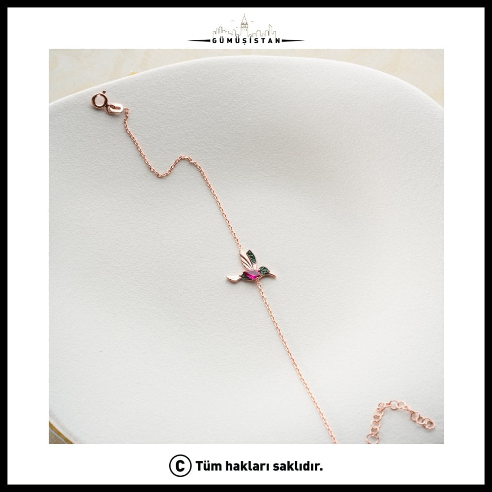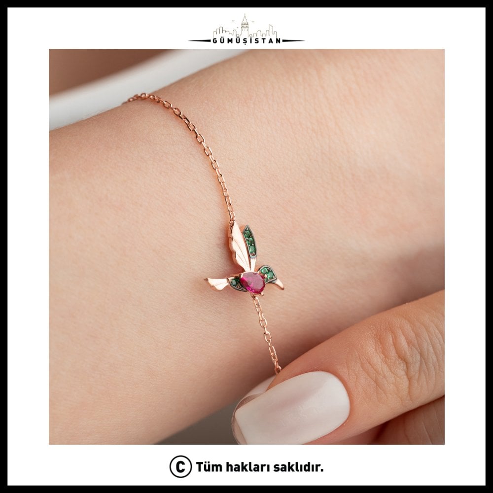 Doğadan ilham alan kuş figürüyle tasarlanan bu 925 ayar gümüş bileklik, renkli taş detaylarıyla zarif ve dikkat çekici bir görünüm sunar. İnce ve minimal zincir yapısı sayesinde hem günlük kullanıma hem de özel günlerde şık kombinlerinize kolayca uyum sağlar.