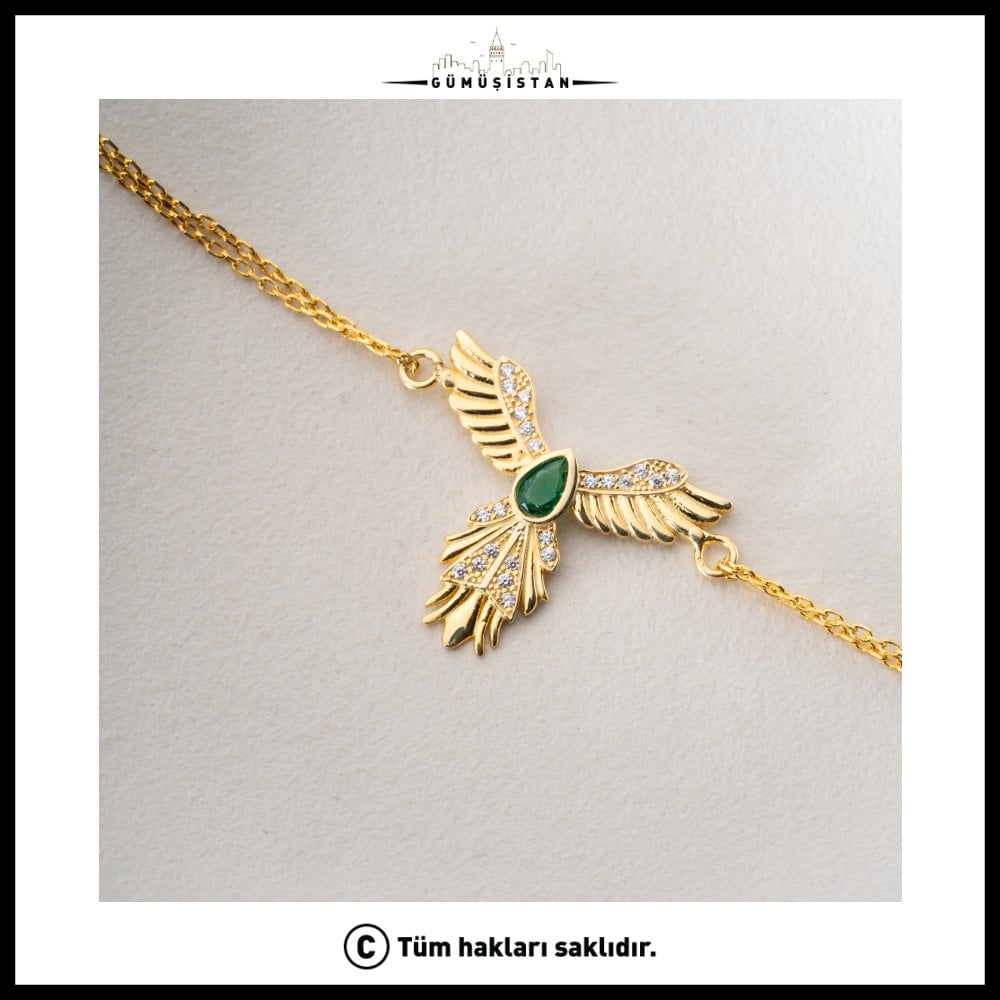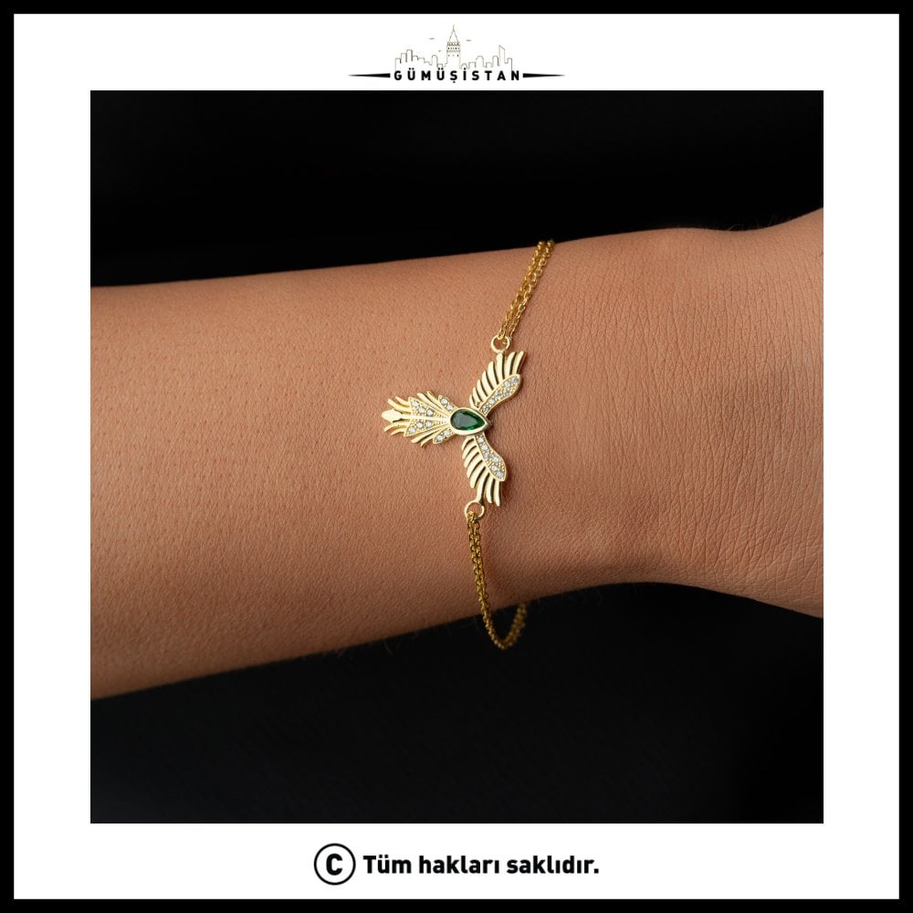 Yeniden doğuşun, gücün ve umudun sembolü olan Anka kuşu, bu özel tasarım bileklikte zarafetle hayat buluyor. 925 ayar gümüş üzerine işlenen anka figürü, göz alıcı yeşil taş detayıyla birleşerek hem anlamlı hem de dikkat çekici bir görünüm sunar. Yeşilin enerjisiyle bütünleşen bu tasarım, doğanın tazeliğini ve yenilenmeyi simgeler.