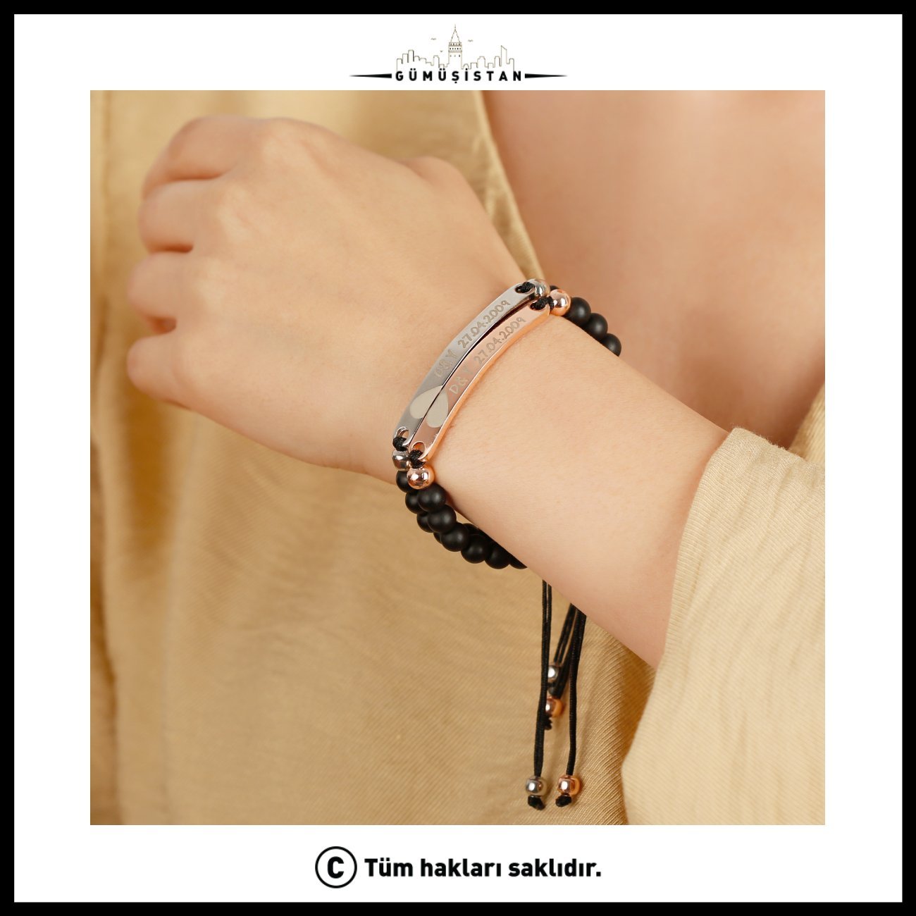 Sizler için özenle üretilen İsimli-Tarihli çift bilekliğine istediğiniz kişiselleştirmeyi yapabilirsiniz. İster sevgilinizle, ister en yakın arkadaşınızla isimlerinizi veya sizin için önemli olan tarihi de yazabilirsiniz. Kadınlar için Rose Gold erkekler için Silver rengi önerilir. Dilerseniz iki rengi de aynı isteyebilirsiniz.