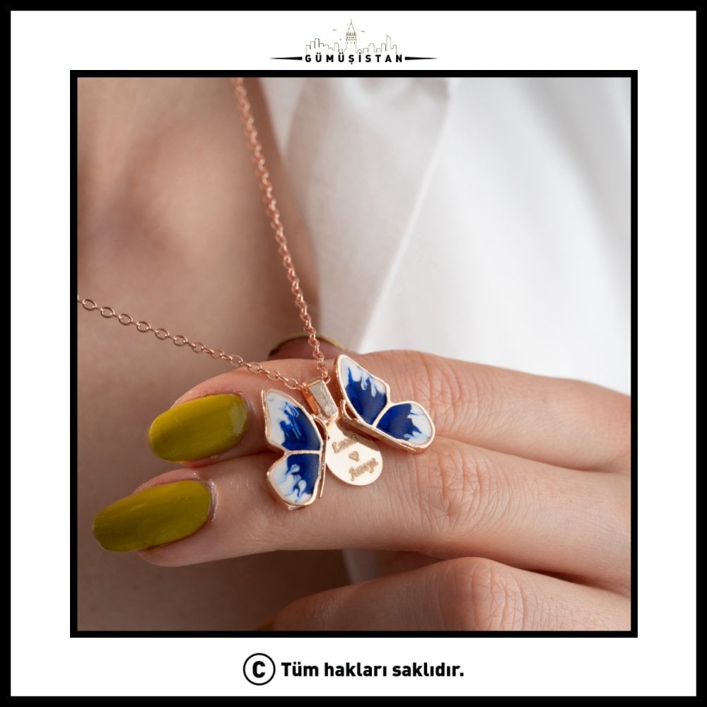 Kolyenin ana özelliği, kanatları açılabilen ve içerisine gizli bir isim veya özel bir söz yazılabilecek kelebek figürüdür. Bu özel tasarım, kolyenin benzersizliğini vurgular ve sevdiklerinize özel bir anlam katmanızı sağlar. İç kısma yazdırılan isim veya söz, kolyenin sahibine özel bir anı ve anlam taşır.
