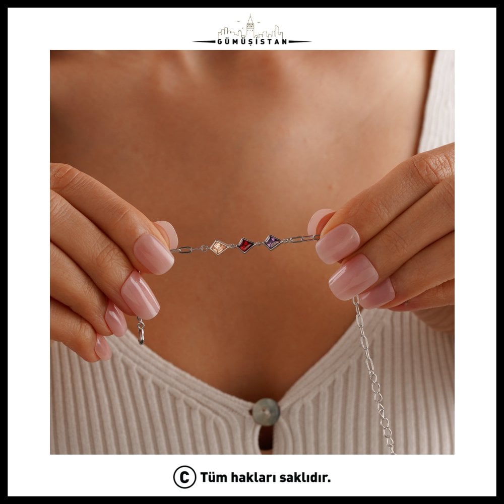 Minimal ama dikkat çekici prizma formu, ışığı farklı açılardan yansıtarak bileklikte zarif bir ışıltı oluşturur. Doğum taşı ise bu modern tasarımı tamamen kişiye özel hale getirir.