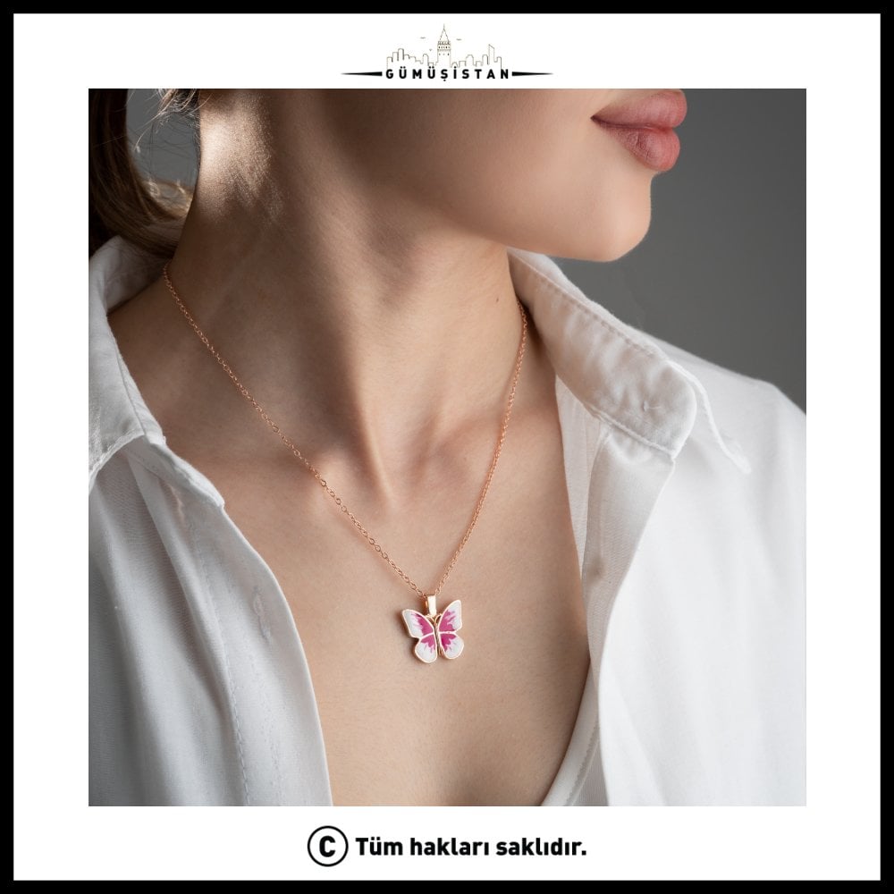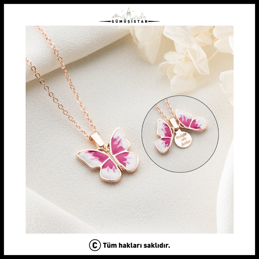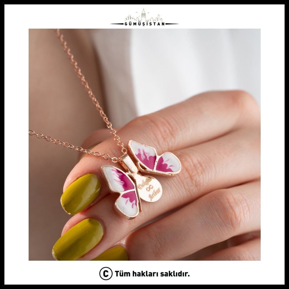 Dışarıdan zarif ve göz alıcı bir pembe kelebek… İçinde ise sadece size ait bir mesaj. İnce ve şık zincir yapısı sayesinde gün boyu rahat kullanım sağlar ve her stile uyum sağlar.